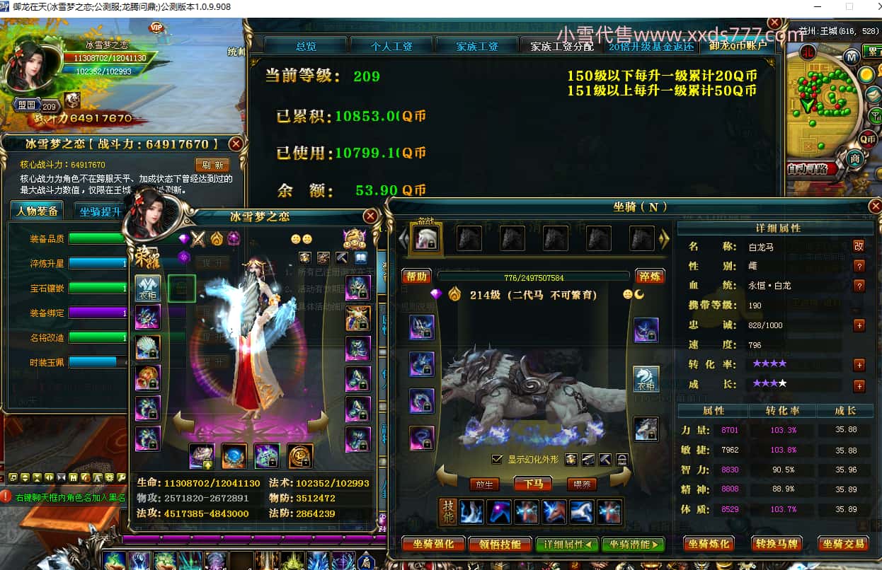 编号T23733 冰雪梦之恋 龙腾问鼎 益州 等级209级 6491W战力 人物12X 传人12X 副将12X 马9X 人物铭刻3件14级6件12级 点亮3件14星6件12星 马铭刻12级 点亮12星 人物绿龙印 马1件黄+4件蓝龙印 五等单双属性石头 蓝白孔