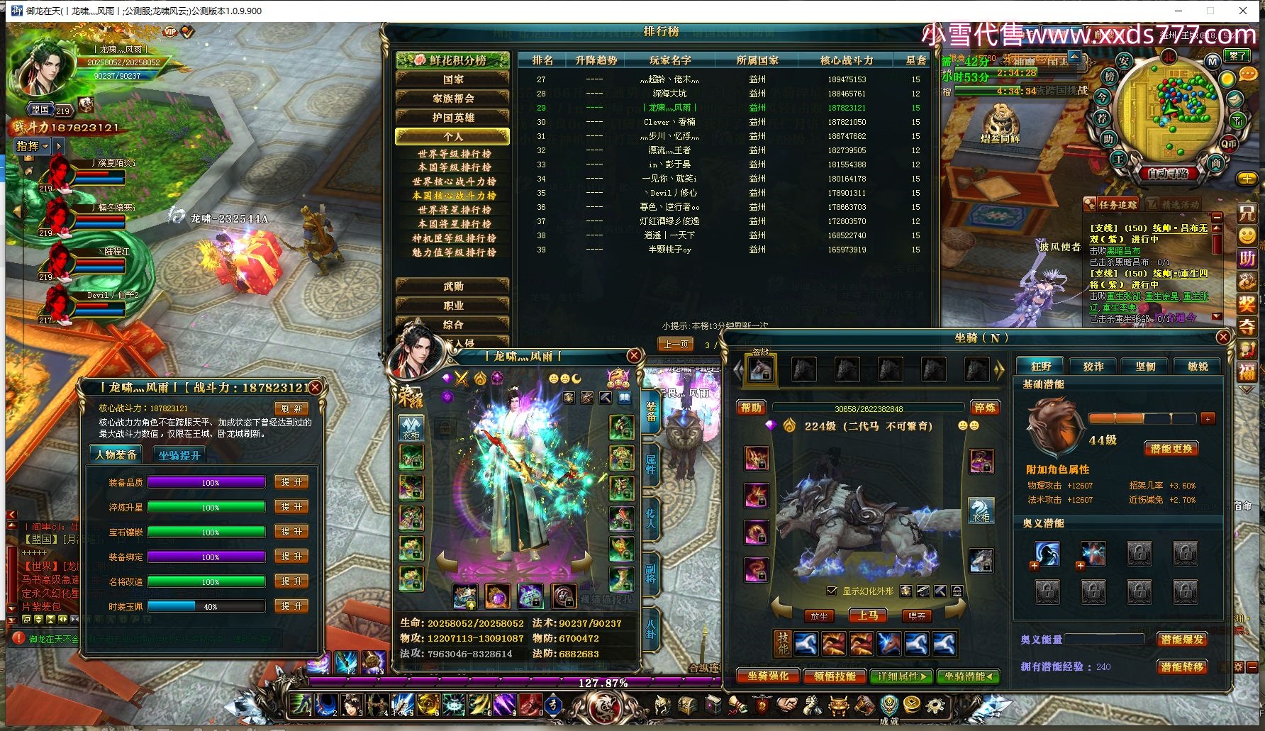 编号X23039 丨龙啸灬风雨丨 龙啸风云 益州 本国排名29名 18782W战力 人物黄金史诗紫15X(5件混沌) 传人精良紫15X 副将精良紫12X 马史诗紫12X 精良紫15披风 人物星魂16级 传人星魂9级 副将星魂6级 马星魂14级 人物铭刻15级 人物点亮16星 马铭刻12级 点亮12星 人物绿龙印 马黄龙印 六等单双属性神圣完美优秀石头 黄蓝孔