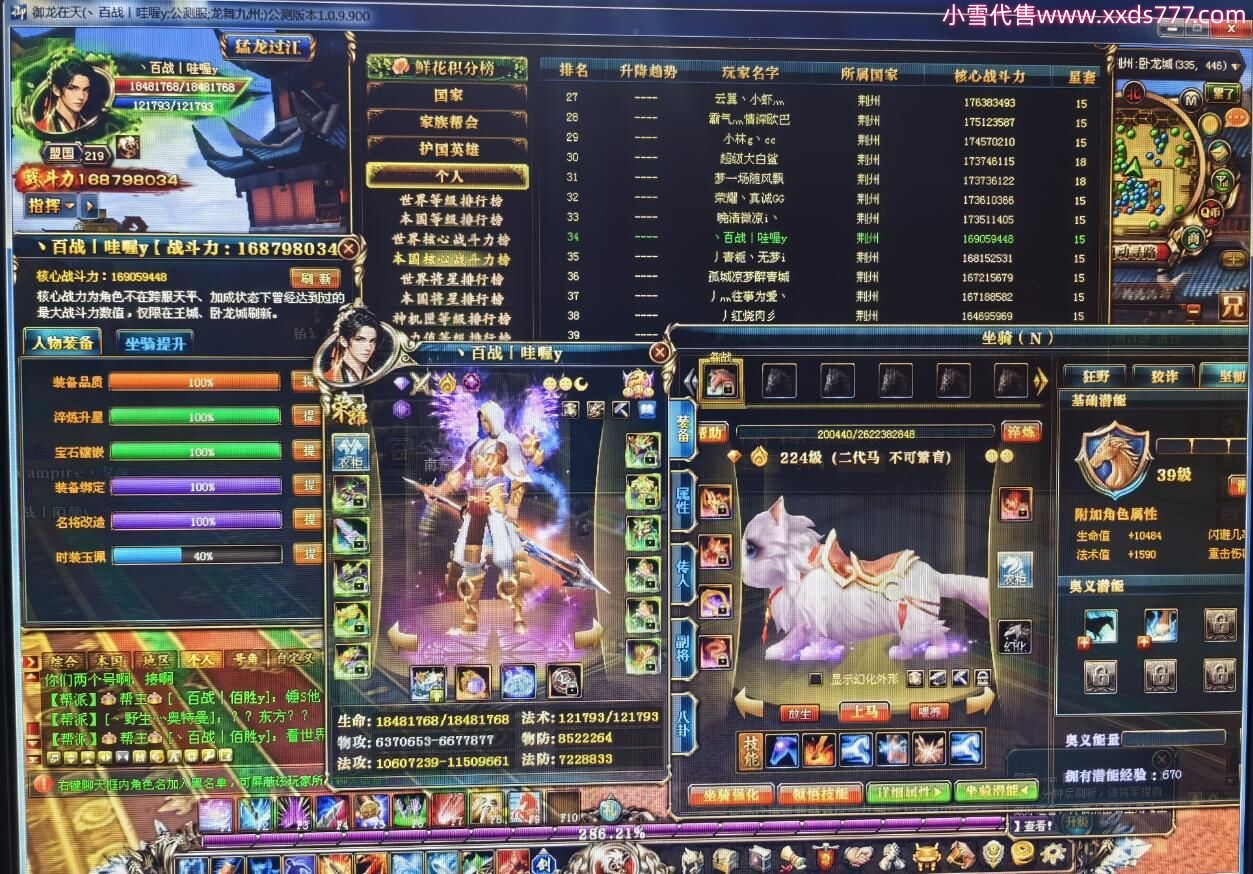 编号X23140 批嘴少嚼iiiiii 龙啸风云 青州 3260W战力 人物黄金史诗紫12X(9件混沌) 传人史诗紫12X 副将精良紫12X 马精良紫11X 加强紫13披风 人物星魂12级 传人星魂4级 马星魂5级 人物铭刻6件15级1件14级其余12级 人物点亮6件12星其余10星 马铭刻12级 点亮4件12星1件10星 人物绿龙印(1件紫龙印) 马蓝龙印 五六等单双属性神圣完美优秀石头 蓝黄孔