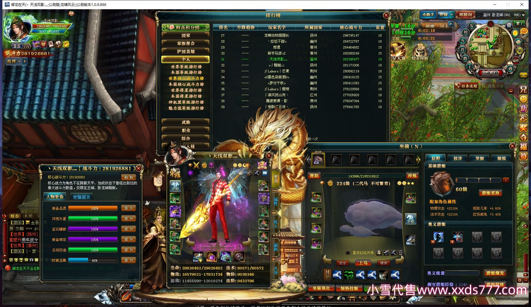 编号X22864 丶流水葬落花灬 龙啸风云 江州 本国排名34名 16319W战力 人物黄金史诗紫12X(2件18X4件15X8件混沌) 传人精良紫12X 副将精良紫12X 马普通橙12X 极品紫15披风 人物星魂16级 传人星魂9级 副将星魂6级 马星魂14级 人物铭刻15级 人物点亮2件16星其余14星 马铭刻2件14级1件13级其余12级 点亮12星 人物绿龙印 马黄龙印 五六等单双属性神圣完美优秀石头 蓝黄孔 已开完永久15星套 可以转移百分百安全