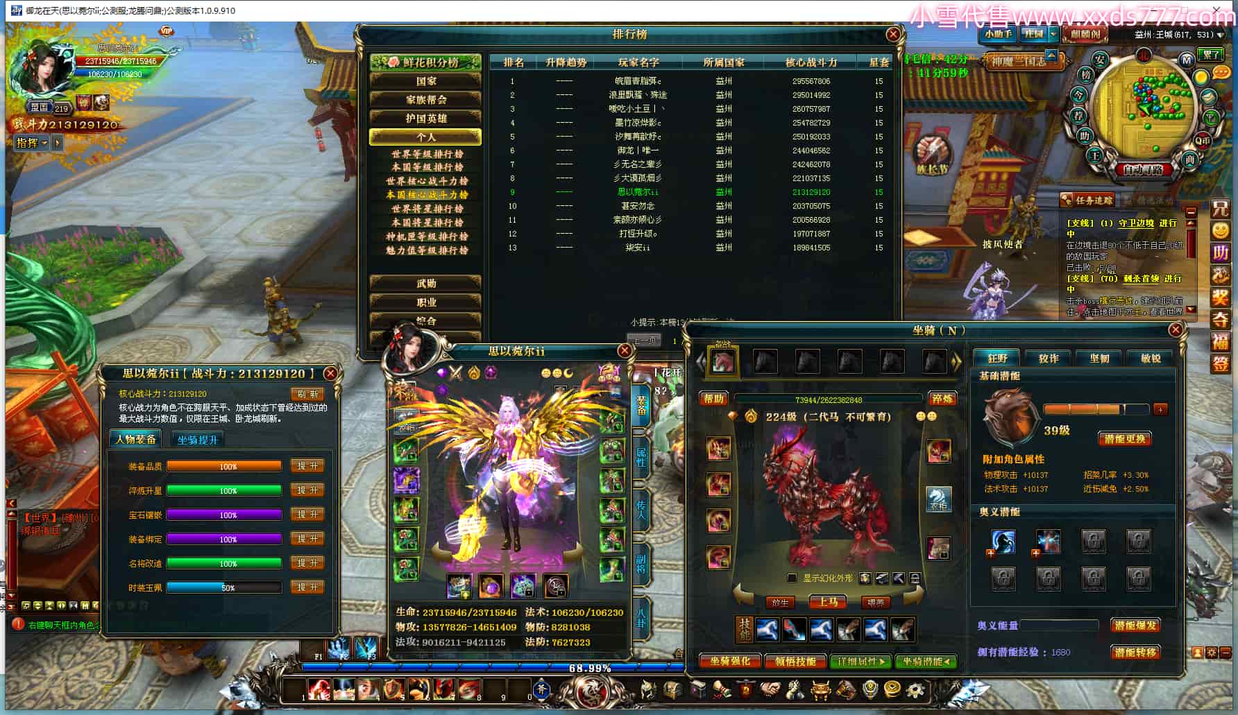 编号T23844 大眼萌i 龙腾问鼎 豫州 本国排名81名 7205W战力 人物精良紫12X(5件15X) 传人精良紫12X 副将精良紫12X 马极品紫9X 加强紫11披风 人物星魂6级 传人星魂3级 马星魂3级 人物铭刻1件13级其余12级 点亮12星 马铭刻12级 点亮10星 人物黄龙印(2件绿龙印) 马蓝龙印 五等单双属性完美无暇神圣石头 白孔 可以转移百分百安全