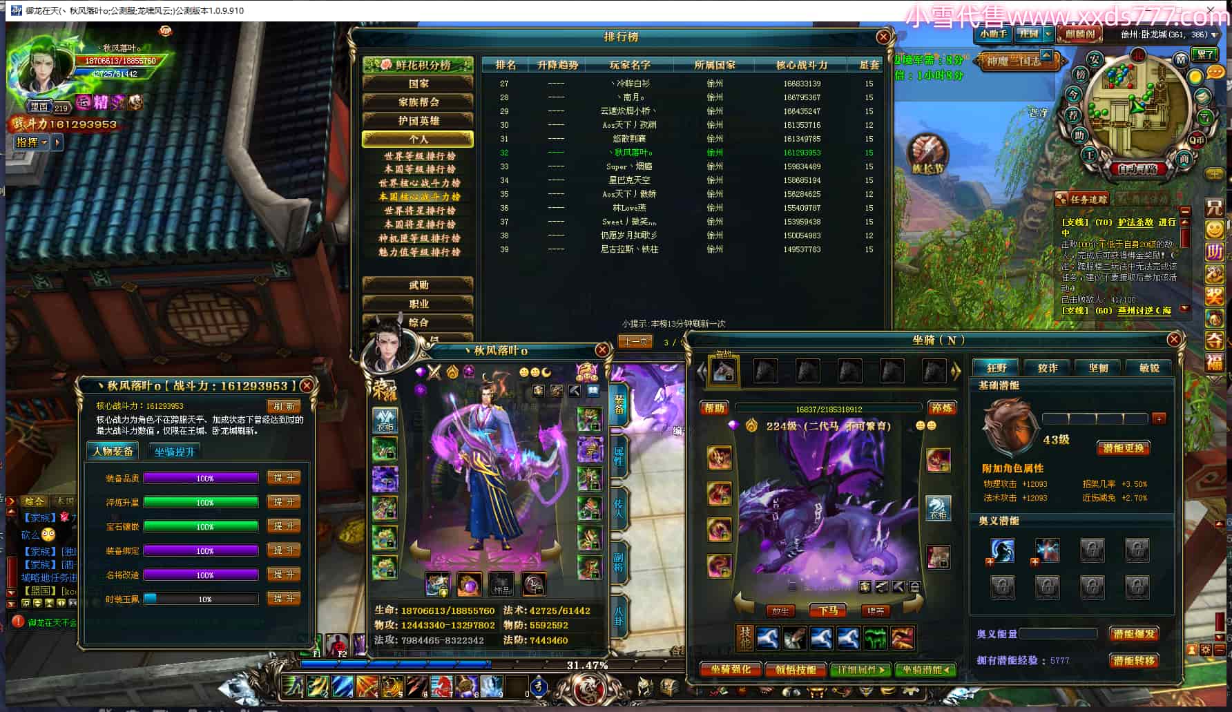 编号L17696 没什么毛病呢 龙啸长空 世界排名第65名20.4W战力 人物极品绿8X(10件9X) 马普通紫3X 龙魂70级 单投资 双月卡 444等单双属性石头