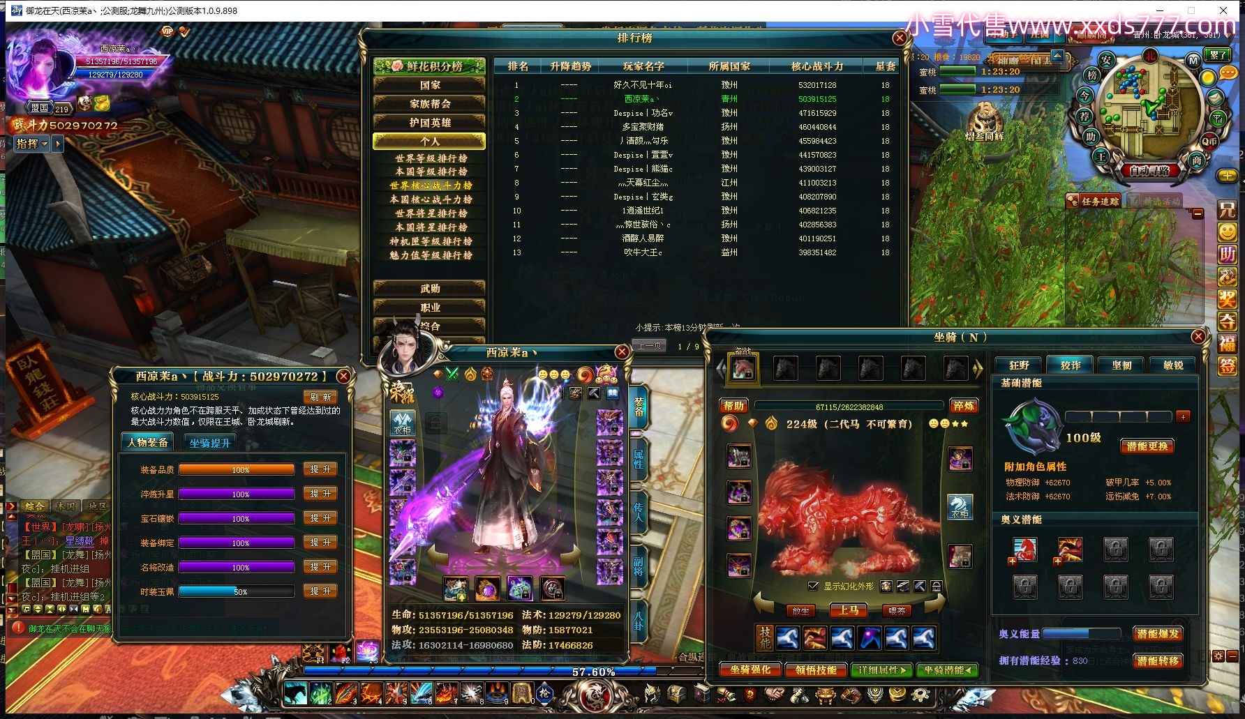 编号L22282 扬帆丶苡大人 龙战王者 燕州 本国排名68名 2373W战力 人物精良紫12X(3件混沌) 马极品紫9X 人物绿龙印 马黄龙印 六等单双属性石头