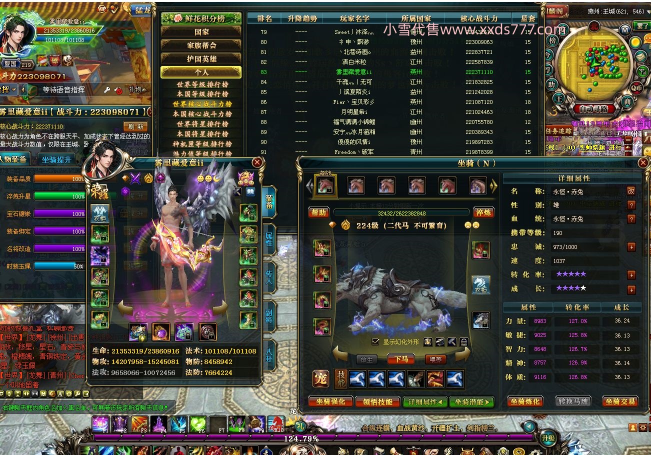 编号X23017 雾里藏爱意ii 龙啸风云 世界排名83名 22309W战力 人物黄金加强橙15X(7件混沌) 传人史诗紫15X 副将史诗紫12X 马普通橙12X 极品紫16披风 人物星魂16级 传人星魂16级 副将星魂8级 马星魂16级 人物铭刻2件16级其他15级 人物点亮16星 马铭刻2件13级其他12级 点亮马鞍马鞭14星其他12星 人物绿龙印 马绿龙印 五六等单双属性神圣完美无暇石头 绿黄孔