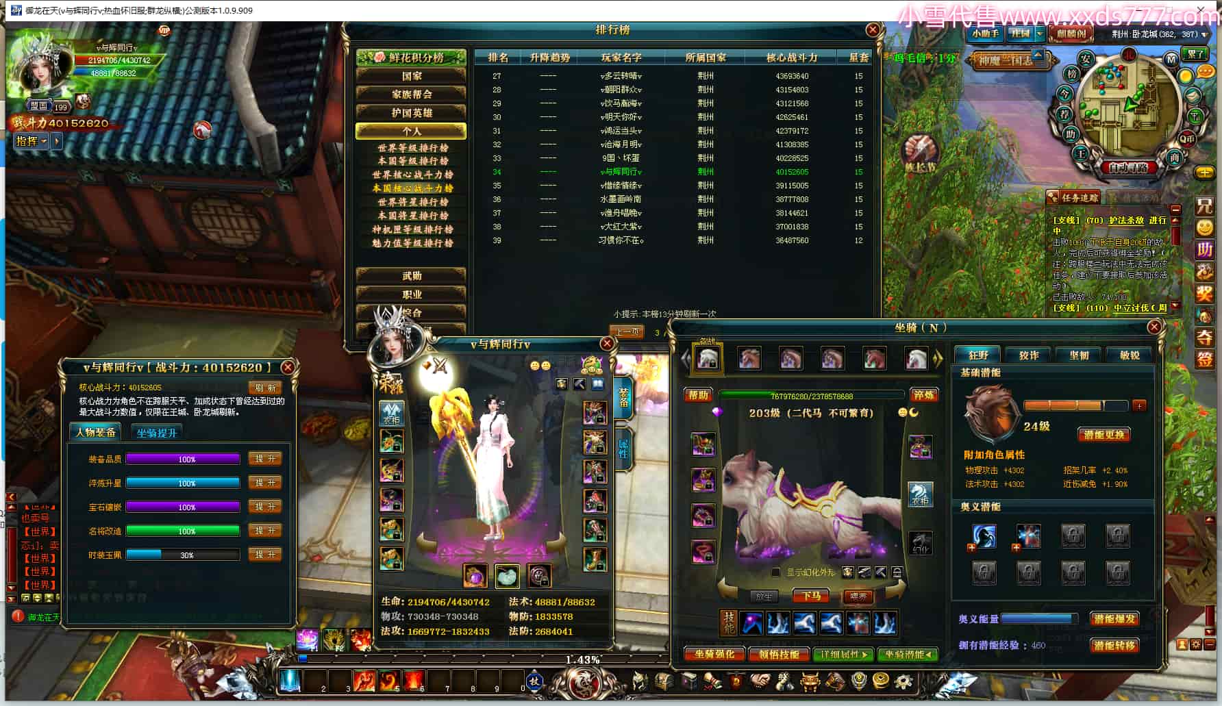 编号S23335 小七ovo 金蛇揽月 幽州 本国排名25名 140级 364W战力 人物普通紫12X(1件18X) 马精良紫6X 人物黄龙印 马黄龙印 六等单双属性石头