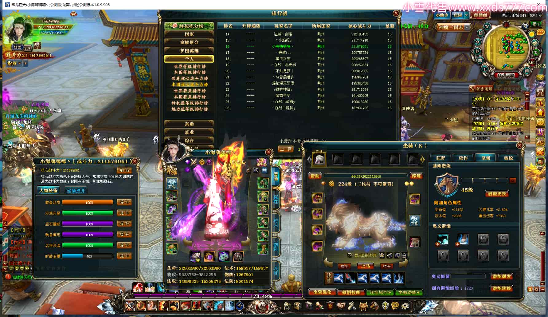 编号W23080 丶百战丨云梦泽 龙舞九州 荆州 世界排名39名 30340W战力 人物黄金精良橙15X(3件18X8件混沌) 传人极品紫15X 副将精良紫15X 马黄金普通橙14X(双潜能66级65级) 史诗紫17披风 人物星魂16级 传人星魂16级 副将星魂9级 马星魂16级 人物铭刻1件18级1件17级1件16级其余15级 点亮16星 马铭刻15级 点亮14星 人物绿龙印(1件紫龙印) 马绿龙印 六等单双属性完美神圣石头 绿紫孔 已开启永久18星套