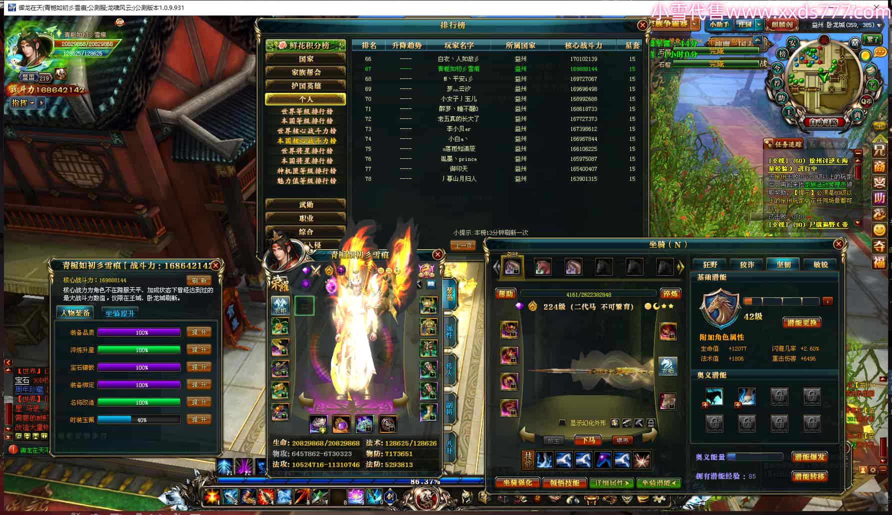 编号X25147 半个西瓜oy 龙啸风云 益州 8301W战力 人物精良紫12X(1件15X) 传人精良紫12X 副将精良紫12X 马极品紫9X 加强紫14披风 人物星魂10级 传人星魂3级 马星魂5级 人物铭刻1件15级4件14级2件13级其余12级 人物点亮1件14星其余12星 马铭刻1件14级其余12级 点亮12星 人物绿龙印 马蓝龙印(2件黄龙印) 五等单双属性神圣完美优秀石头 白孔