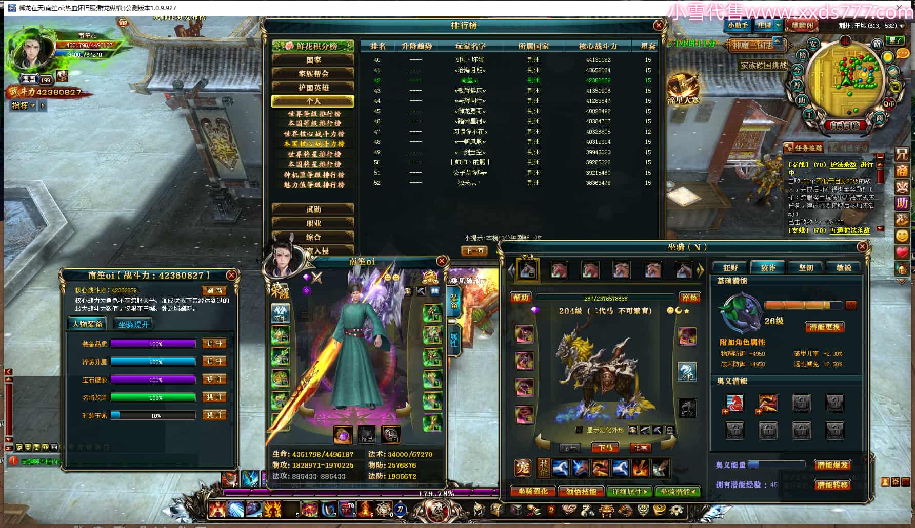 编号Q24996 南笙oi 群龙纵横 荆州 本国排名42名 4236W战力 人物黄金普通橙12X(3件15X2件混沌) 马史诗紫10X 人物绿龙印 马黄龙印 六等单双属性石头 已开完永久15星套