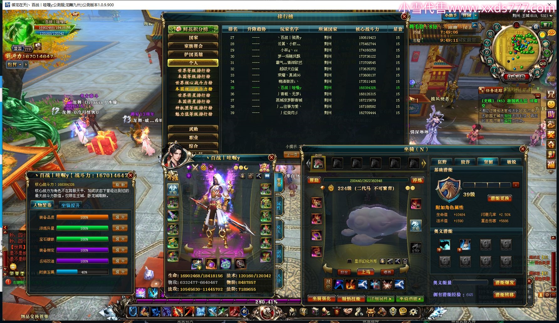 编号W18134 小葱嗷嗷辣 龙舞九州 燕州 5774W战力 人物极品紫12X(4件15X) 传人极品紫12X(3件15X) 副将极品紫12X 马极品紫10X 加强紫14披风 人物星魂11级 传人星魂6级 副将星魂6级 马星魂6级 人物铭刻7件15级1件13级1件12级 人物点亮4件16星1件14星其余12星 马铭刻12级 点亮10星 人物绿龙印 马黄龙印 五等单双属性完美无暇石头 白孔