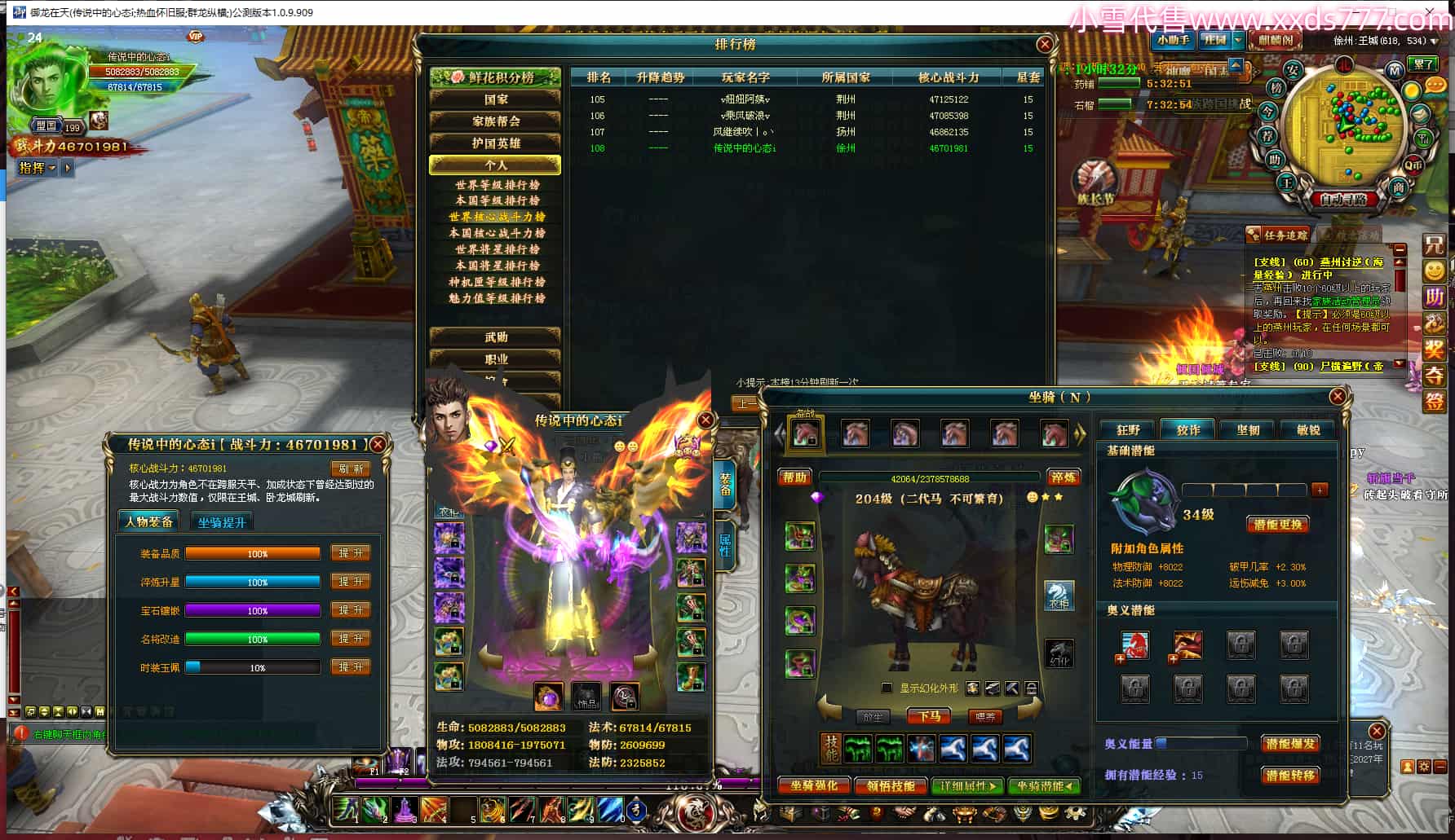 编号Q23788 传说中的心态i 群龙纵横 徐州 世界排名108名 4670W战力 人物黄金极品橙12X(4件15X5件混沌) 马史诗紫8X 人物绿龙印(4件紫龙印) 马绿龙印 六等单双属性石头 已开完永久15星套