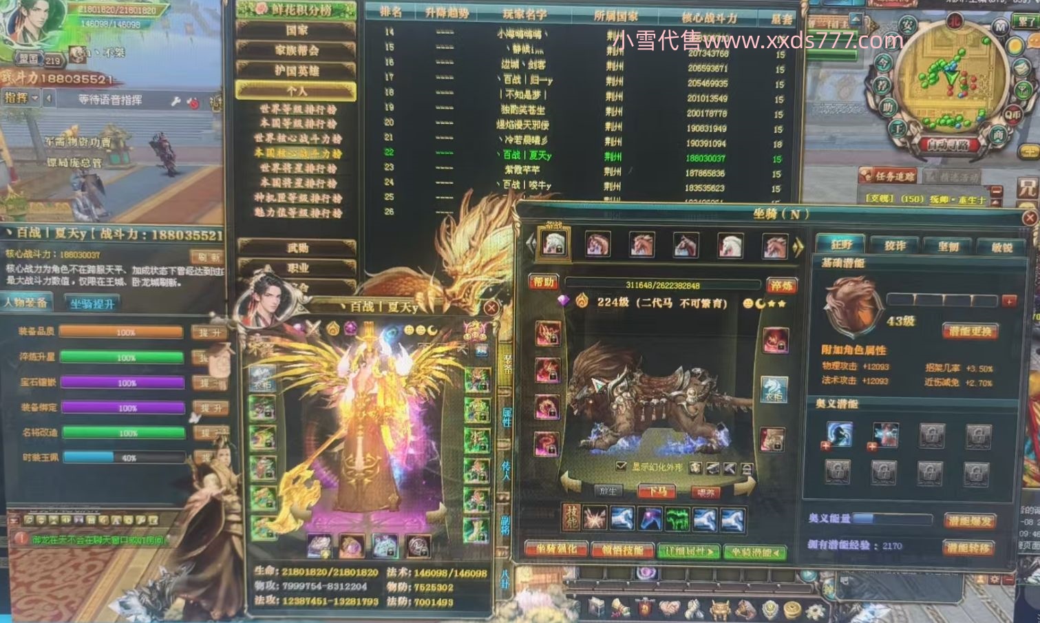 编号Z23055 雾雾雾o 逐鹿天下 荆州 世界排名60名 23528W战力 人物黄金史诗紫15X(7件混沌) 传人精良紫15X 副将史诗紫12X 马普通橙13X(双潜能50级41级) 极品紫16披风 人物星魂16级 传人星魂12级 副将星魂6级 马星魂16级 人物铭刻15级 差一件戒指点亮16星 马铭刻13级 点亮14星 人物绿龙印 马黄龙印 五六等单双属性神圣完美无暇石头 黄绿孔 已开启永久18星套