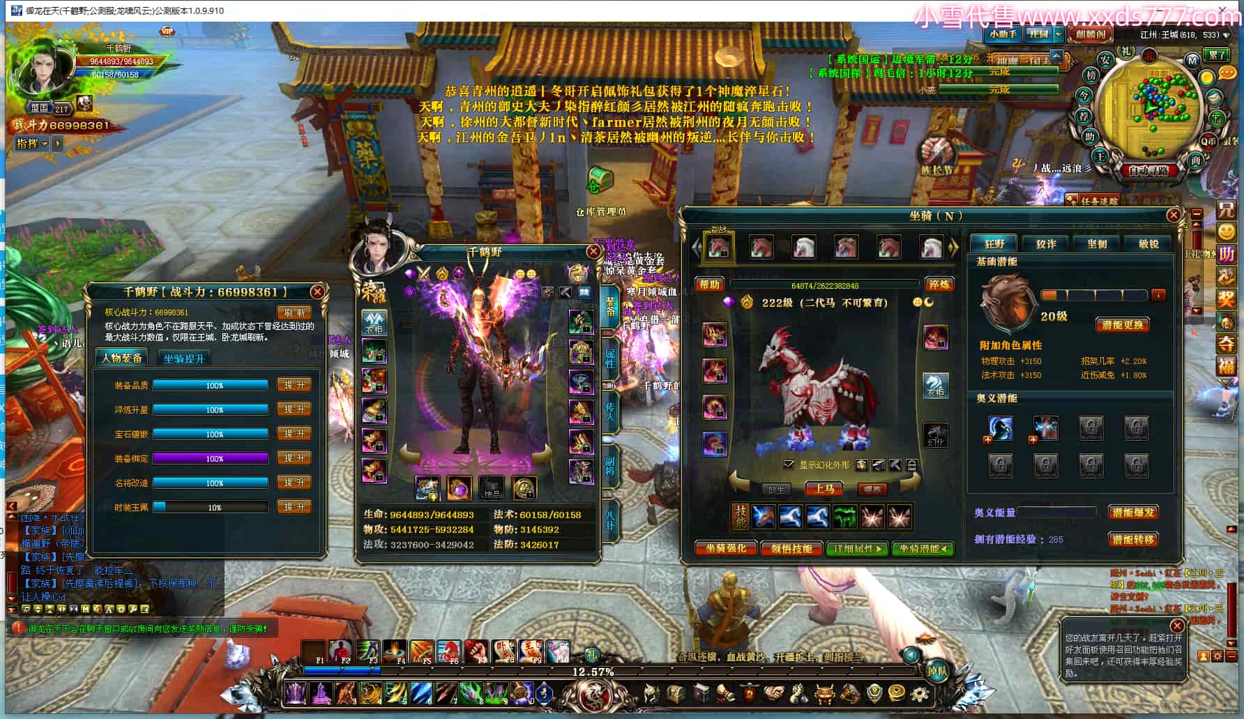 编号T23425 童彡 龙腾问鼎 幽州 210级 人物12X点星号 铭刻12级 点亮12星 传人12X 副将12X 马9X 人物高淬50个 坐骑中淬60个 坐骑高淬15个