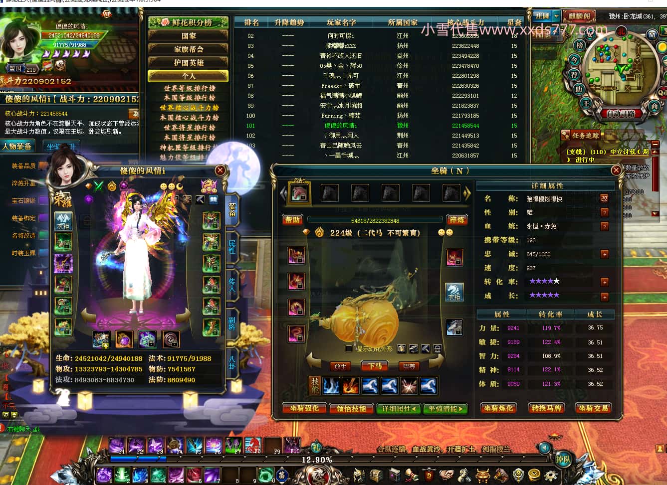 编号W23220 调皮大王c 龙舞九州 益州 世界排名38名 30414W战力 人物混沌极品橙15X(2件18X) 传人史诗紫15X 副将史诗紫15X 马黄金加强橙14X(双潜能54级54级) 史诗紫18披风 人物星魂16级 传人星魂16级 副将星魂6级 马星魂16级 人物铭刻2件18级1件17级2件16级其余15级 点亮2件18星其余16星 马铭刻14级 点亮14星 人物紫龙印 马黄龙印(4件绿龙印)六等单双属性神圣无瑕完美石头 绿紫孔 已开完永久18星套 可以转移百分百安全