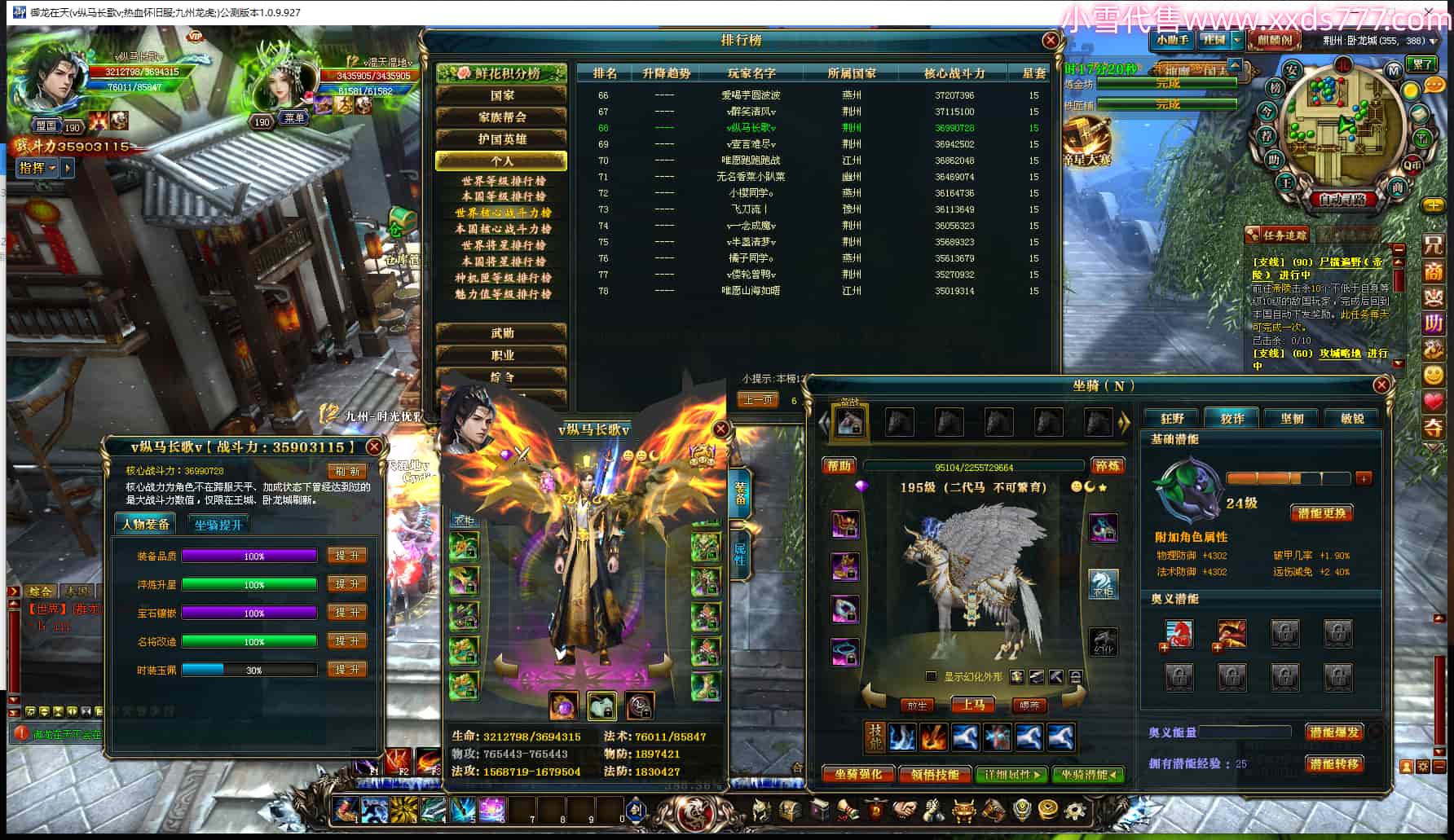 编号Q24981 丶米粒o 群龙纵横 青州 世界排名23名 7247W战力 人物黄金精良橙15X(3件18X9件混沌) 马黄金精良橙12X 人物紫龙印 马绿龙印 六等单双属性石头 已开完永久15星套 可以转移百分百安全