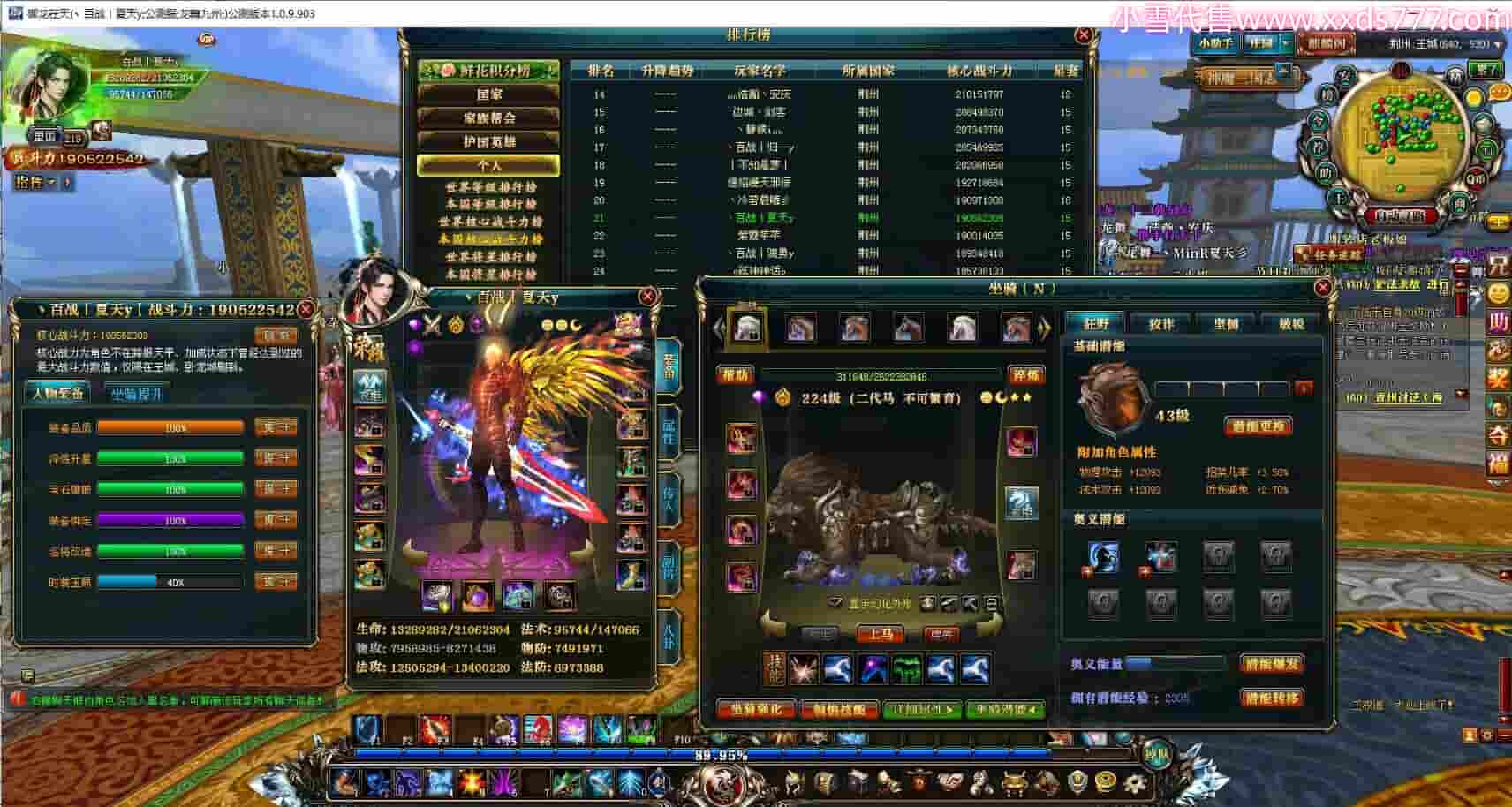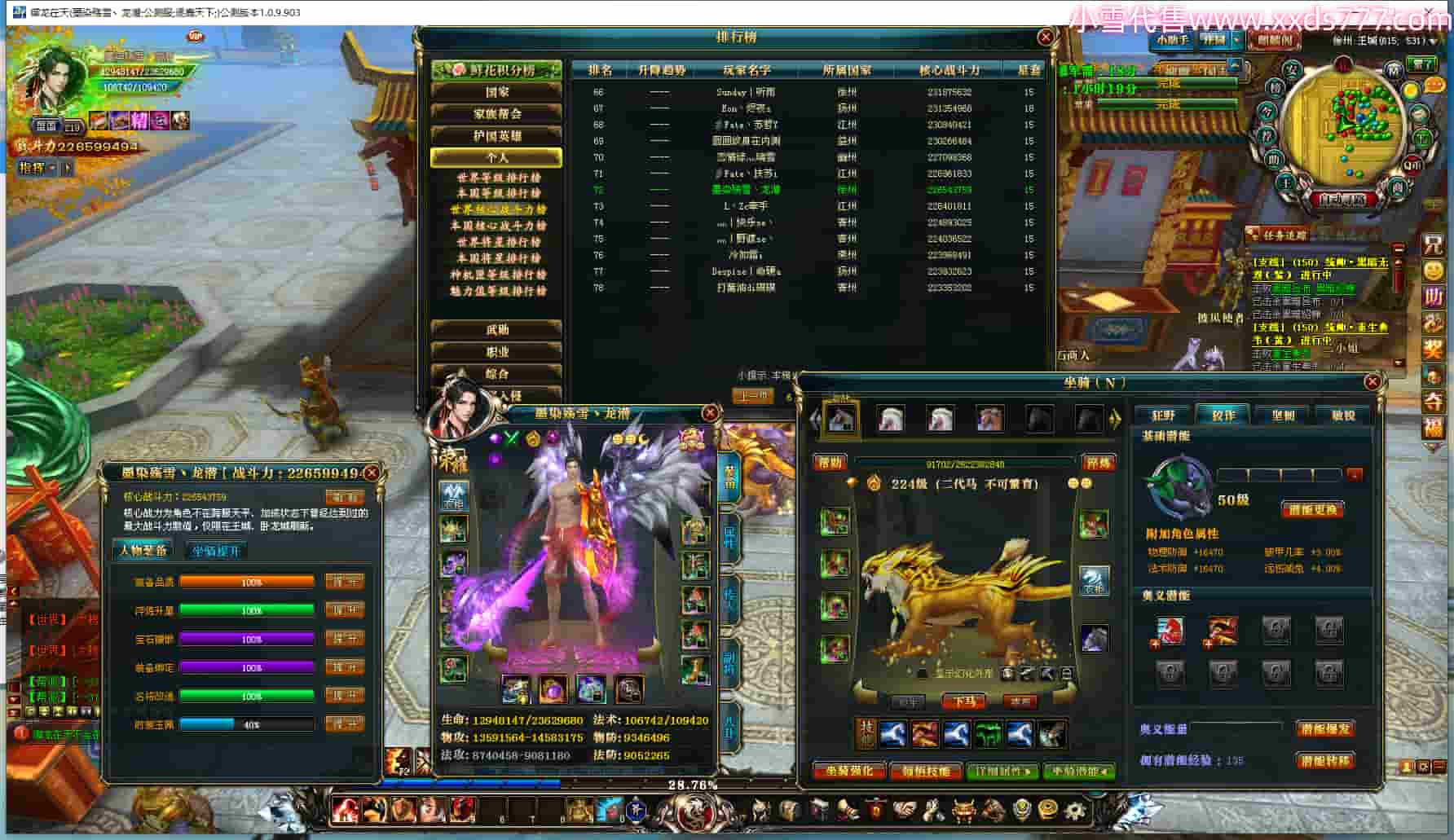 编号W23326 心瑶瑶o 龙舞九州 幽州 本国排名54名 13300W战力 人物黄金史诗紫12X(1件18X4件15X4件混沌) 传人精良紫12X 副将极品紫12X 马史诗紫10X 精良紫15披风 人物星魂16级 传人星魂13级 马星魂11级 人物铭刻15级 点亮5件14星其余12星 马铭刻2件15级其余14级 点亮10星 人物绿龙印 马黄龙印 六等单双属性神圣完美无暇石头 黄白孔