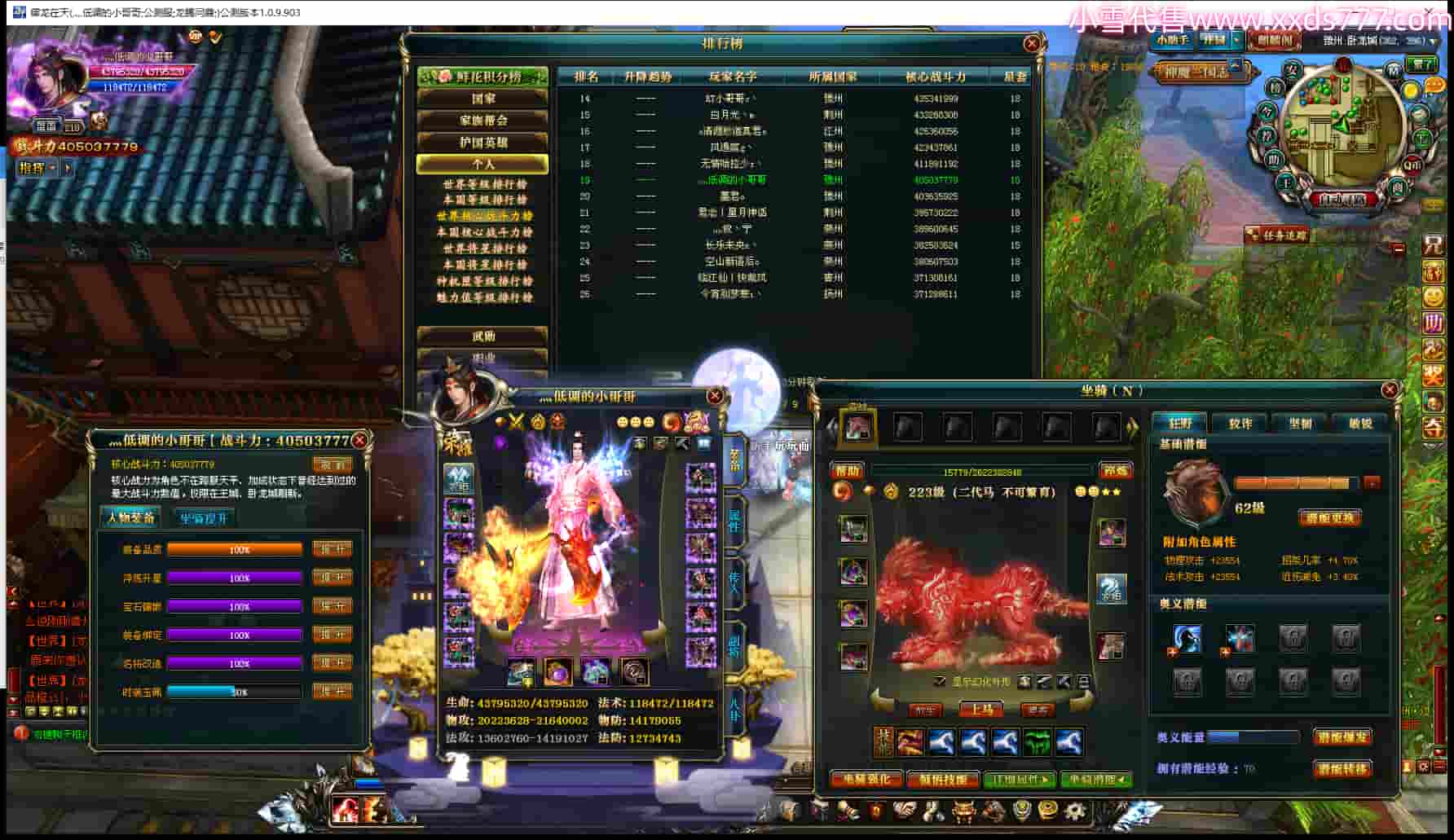 编号T23339 灬低调的小哥哥 龙腾问鼎 豫州 世界排名19名 40503W战力 人物混沌极品橙18X 传人黄金史诗紫18X(6件混沌) 副将黄金普通橙15X(6件18X) 马混沌精良橙14X(双潜能62级60级) 史诗紫17披风 人物星魂16级 传人星魂16级 副将星魂16级 马星魂16级 人物铭刻18级 人物点亮18星 马铭刻2件18级其余16级 点亮1件16星其余14星 人紫龙印 马绿龙印 六等单双属性神圣石头 紫孔