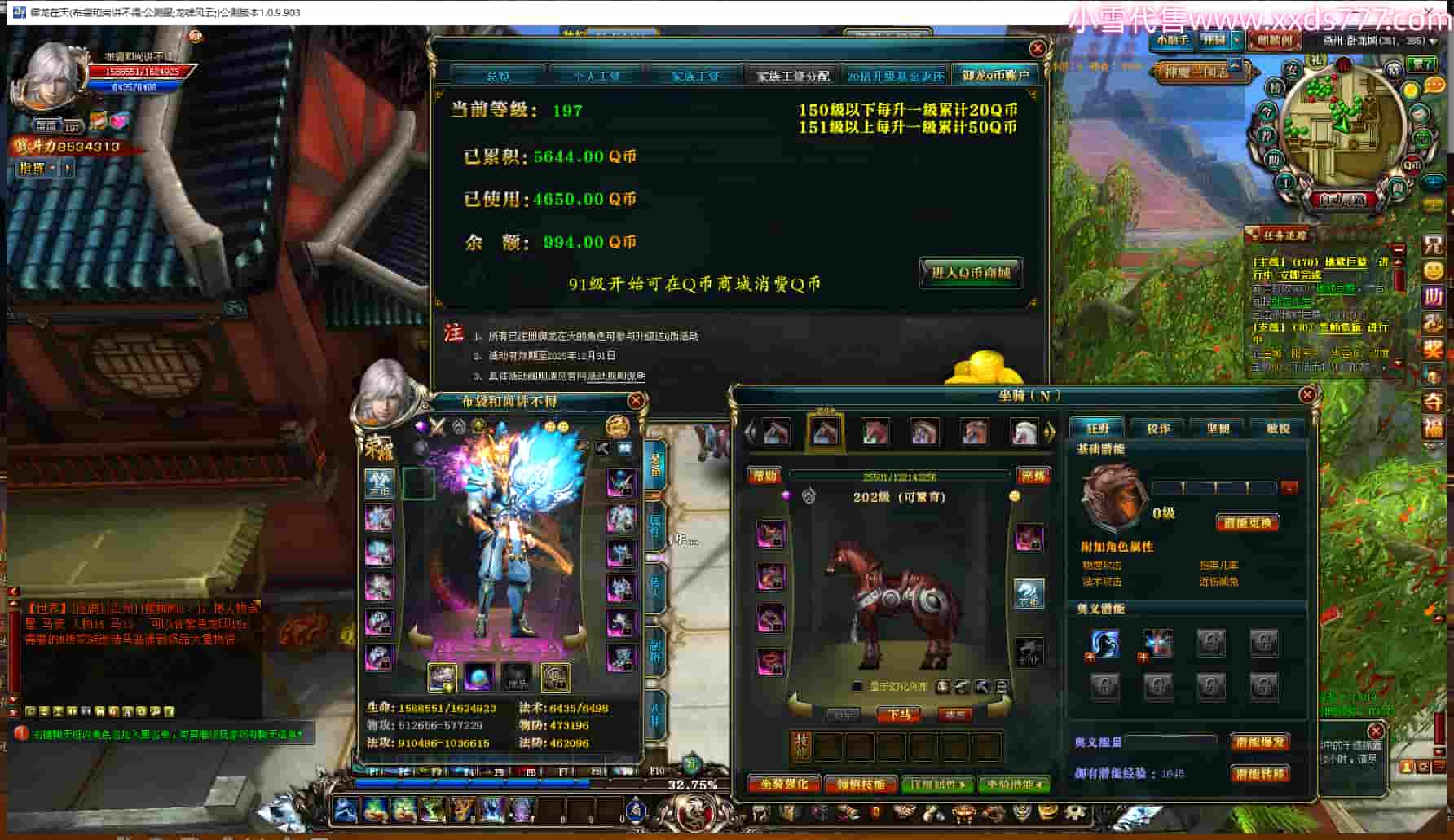 编号X23350 布袋和尚讲不得 龙啸风云 燕州 197级 人物12X点星号 马6X 号内Q币994个 人物高淬490个 坐骑中淬54个