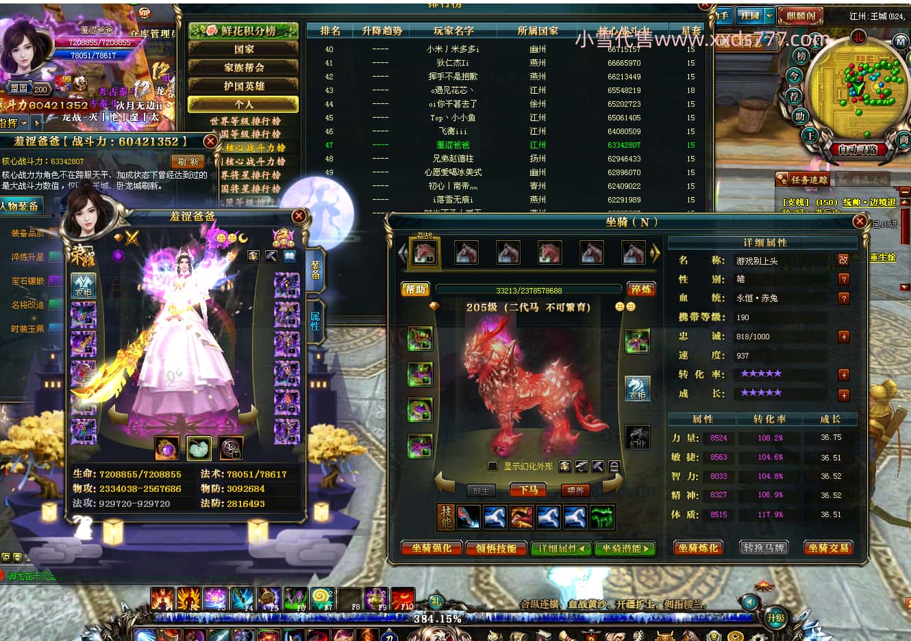 编号S23335 小七ovo 金蛇揽月 幽州 本国排名25名 140级 364W战力 人物普通紫12X(1件18X) 马精良紫6X 人物黄龙印 马黄龙印 六等单双属性石头