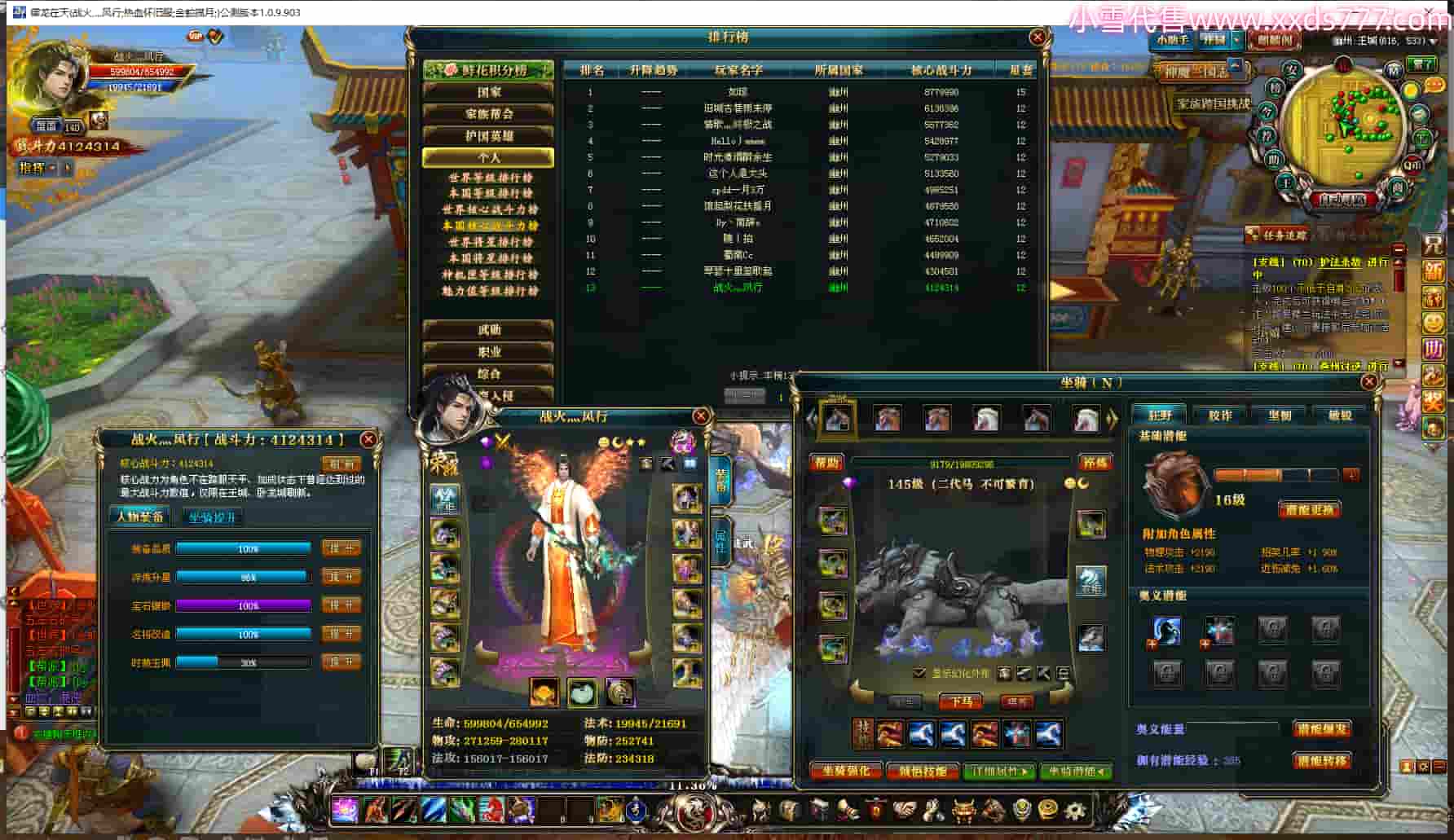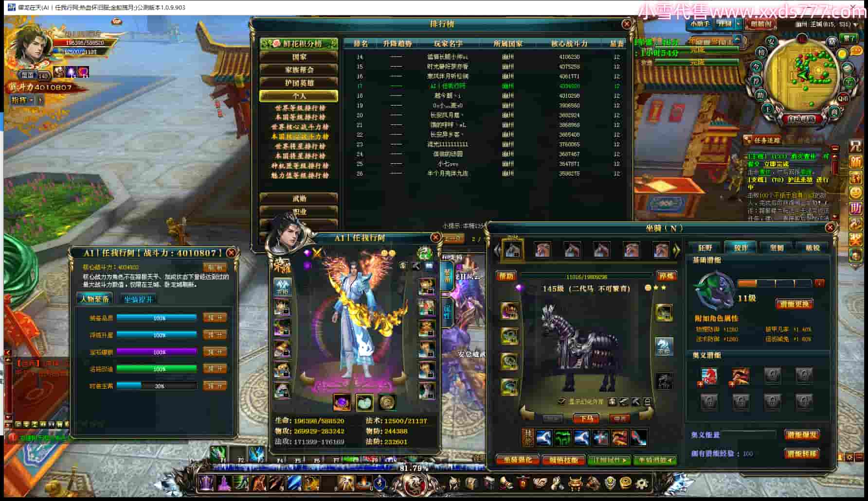 编号S23336 战火灬风行 金蛇揽月 幽州 本国排名13名 140级 412W战力 人物精良紫11X(6件12X) 马精良紫9X 人物黄龙印 马黄龙印 六等单双属性石头