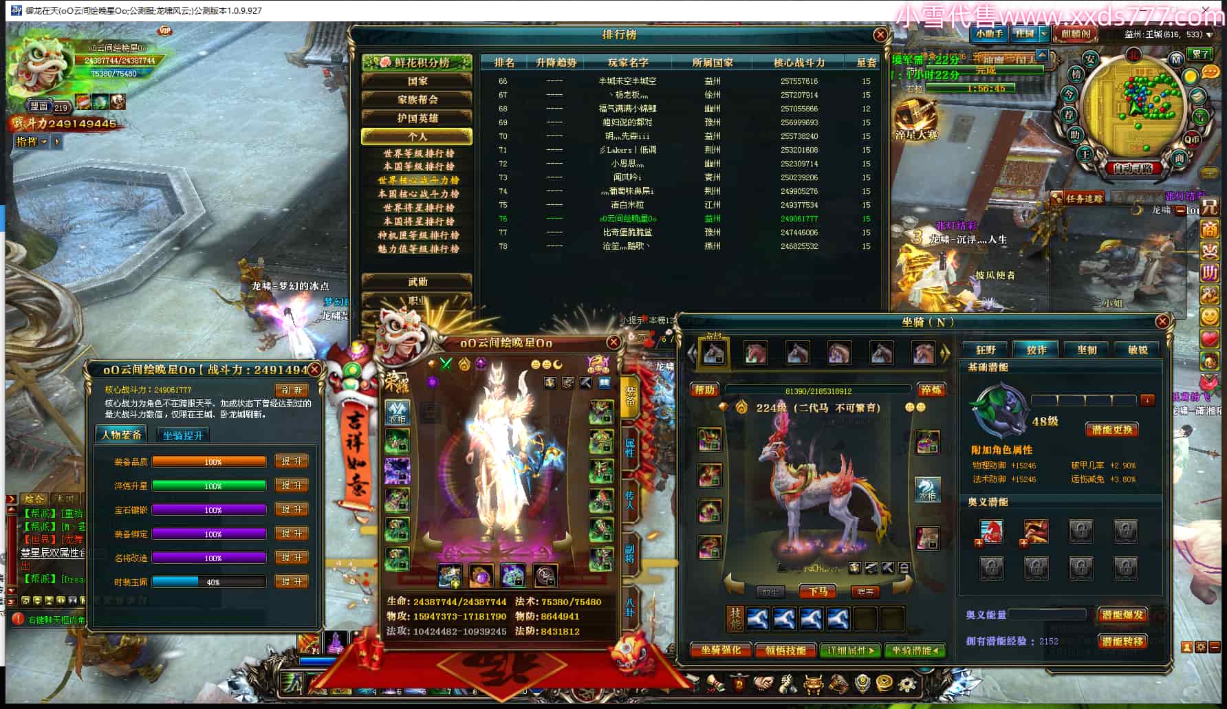 编号X24871 月落知星沉 龙啸风云 扬州 世界排名57名 26702W战力 人物黄金普通橙15X(9件混沌) 传人普通橙15X 副将史诗紫15X 马加强橙13X 极品紫16披风 人物星魂16级 传人星魂16级 副将星魂6级 马星魂16级 人物铭刻1件16级其余15级 点亮16星 马铭刻2件15级其余14级 点亮14星 人物绿龙印 马黄龙印 六等单双属性神圣完美无暇石头 黄绿孔 已开完永久15星套 已开完永久18星套