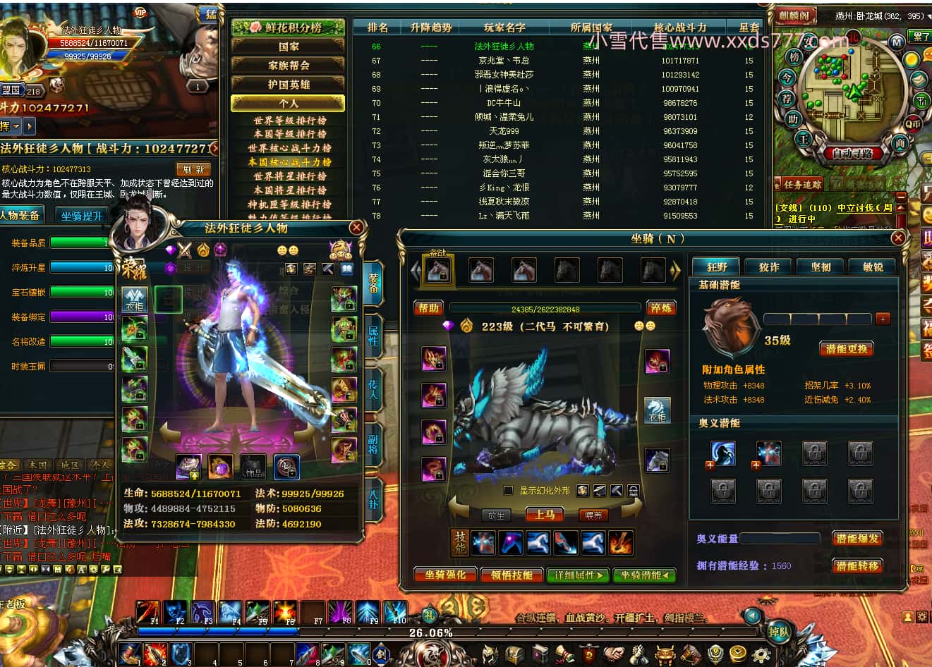 编号W23369 灬莫大侠灬 龙舞九州 益州 本国排名30名 12176W战力 人物史诗紫12X(10件15X5件混沌) 传人精良紫12X 副将精良紫12X 马史诗紫12X 加强紫13披风 人物星魂15级 传人星魂6级 马星魂10级 人物铭刻3件15级其余14级 人物点亮8件14星其余12星 马铭刻12级 点亮12星 人物绿龙印 马黄龙印 五六等单双属性完美无暇神圣石头 蓝白孔