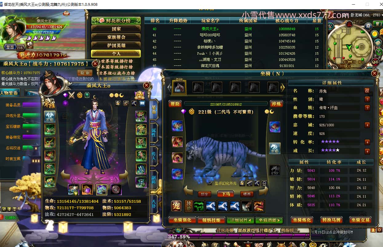 编号W23220 调皮大王c 龙舞九州 益州 世界排名38名 30414W战力 人物混沌极品橙15X(2件18X) 传人史诗紫15X 副将史诗紫15X 马黄金加强橙14X(双潜能54级54级) 史诗紫18披风 人物星魂16级 传人星魂16级 副将星魂6级 马星魂16级 人物铭刻2件18级1件17级2件16级其余15级 点亮2件18星其余16星 马铭刻14级 点亮14星 人物紫龙印 马黄龙印(4件绿龙印)六等单双属性神圣无瑕完美石头 绿紫孔 已开完永久18星套 可以转移百分百安全
