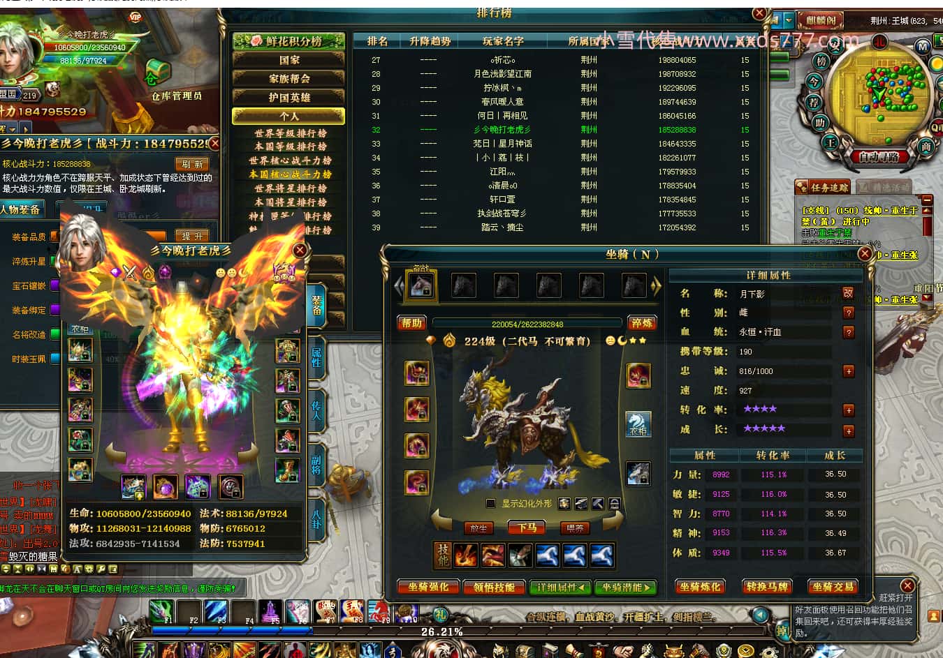 编号T23243 迷人小迷丨帝彡 龙腾问鼎 江州 世界排名40名 32224W战力 人物混沌极品橙15X(7件18X) 传人黄金普通橙15X(1件18X4件混沌) 副将史诗紫15X 马黄金精良橙13X(双潜能50级32级) 极品紫16披风 人物星魂16X 传人星魂16级 副将星魂7级 马星魂16级 人物铭刻5件18级其余15级 点亮1件18星其余16星 马铭刻3件14级其余13级 点亮14星 人物绿龙印 马绿龙印 六等单双属性神圣完美石头 黄绿孔 可以转移百分百安全