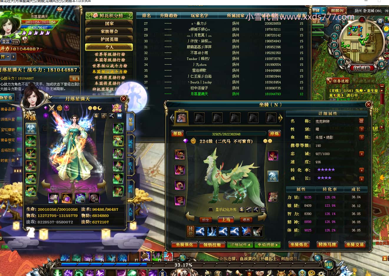 编号X23413 月落星满天 龙啸风云 扬州 本国排名第39名 18104W战力 人物黄金精良紫15X(6件16X )卡的绿15 传人精良紫15X 副将精良紫12X 马史诗紫12X 极品紫15披风 人物星魂16级 传人10级 副将6件 马星魂16级 人物铭刻4件16级其他15级 点亮(项链/主手/副手/戒子/盔甲16星鞋子16点亮绿色)剩下的14星 马铭刻14级 点亮12星 人物绿龙印 马黄龙印 五六等单双属性神圣完美无瑕石头 绿黄蓝白孔 已开完了永久15星套