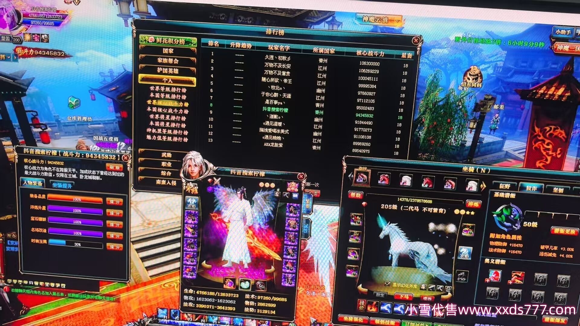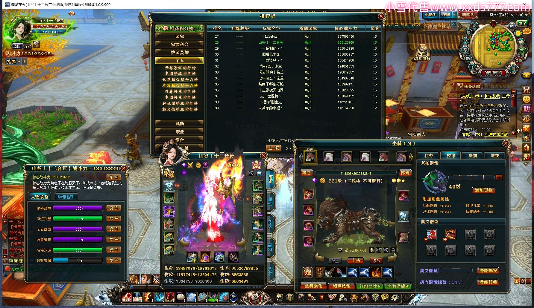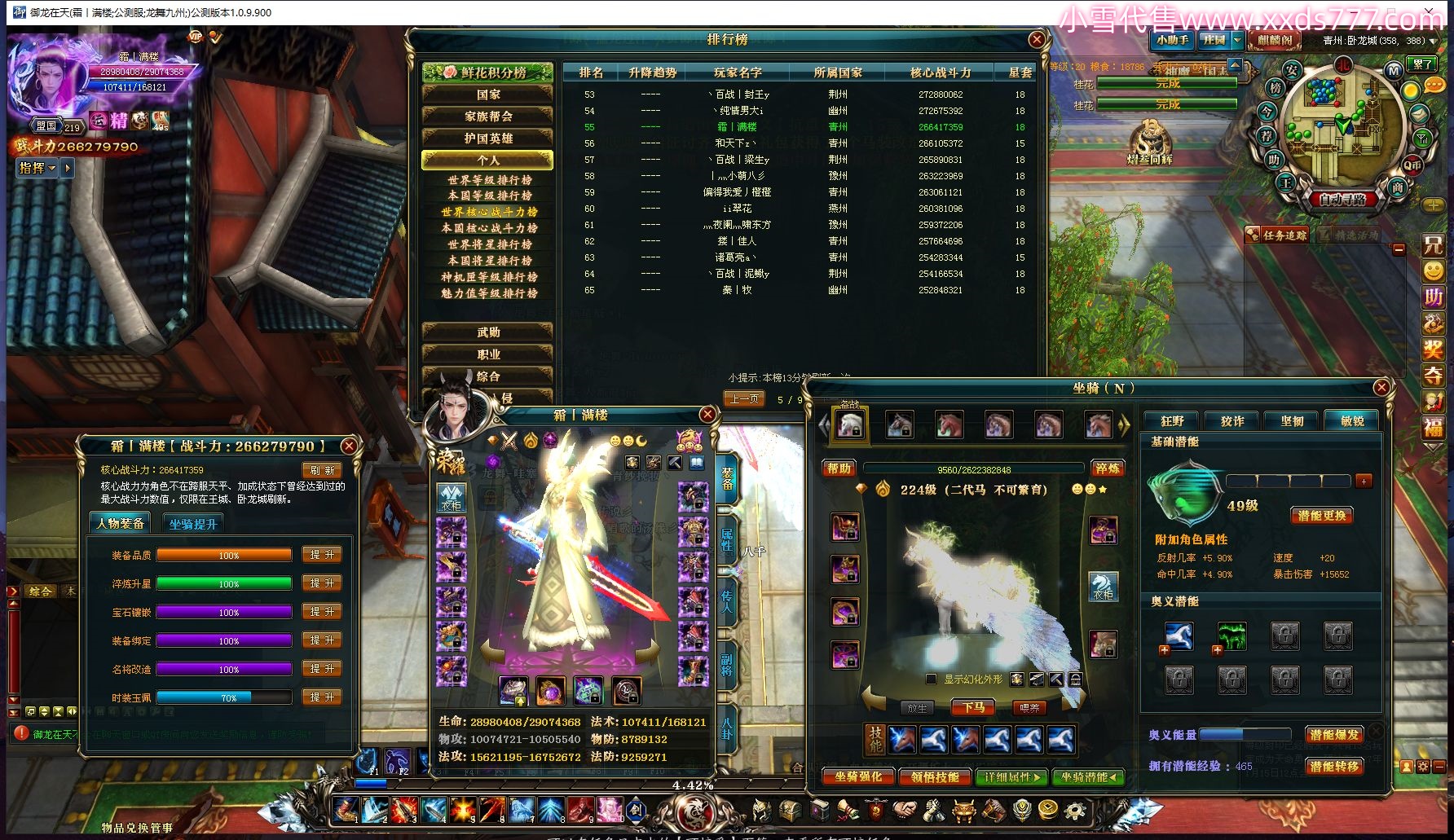 编号Q20722 临安公主Yyds 群龙纵横 徐州 世界排名8名 6275W战力 人物黄金极品橙18X(9件混沌) 马黄金极品橙13X(双潜能50级39级) 人物紫龙印 马绿龙印 六等单双属性石头 已开完永久15星套 已开1次永久18星套 可以转移百分百安全