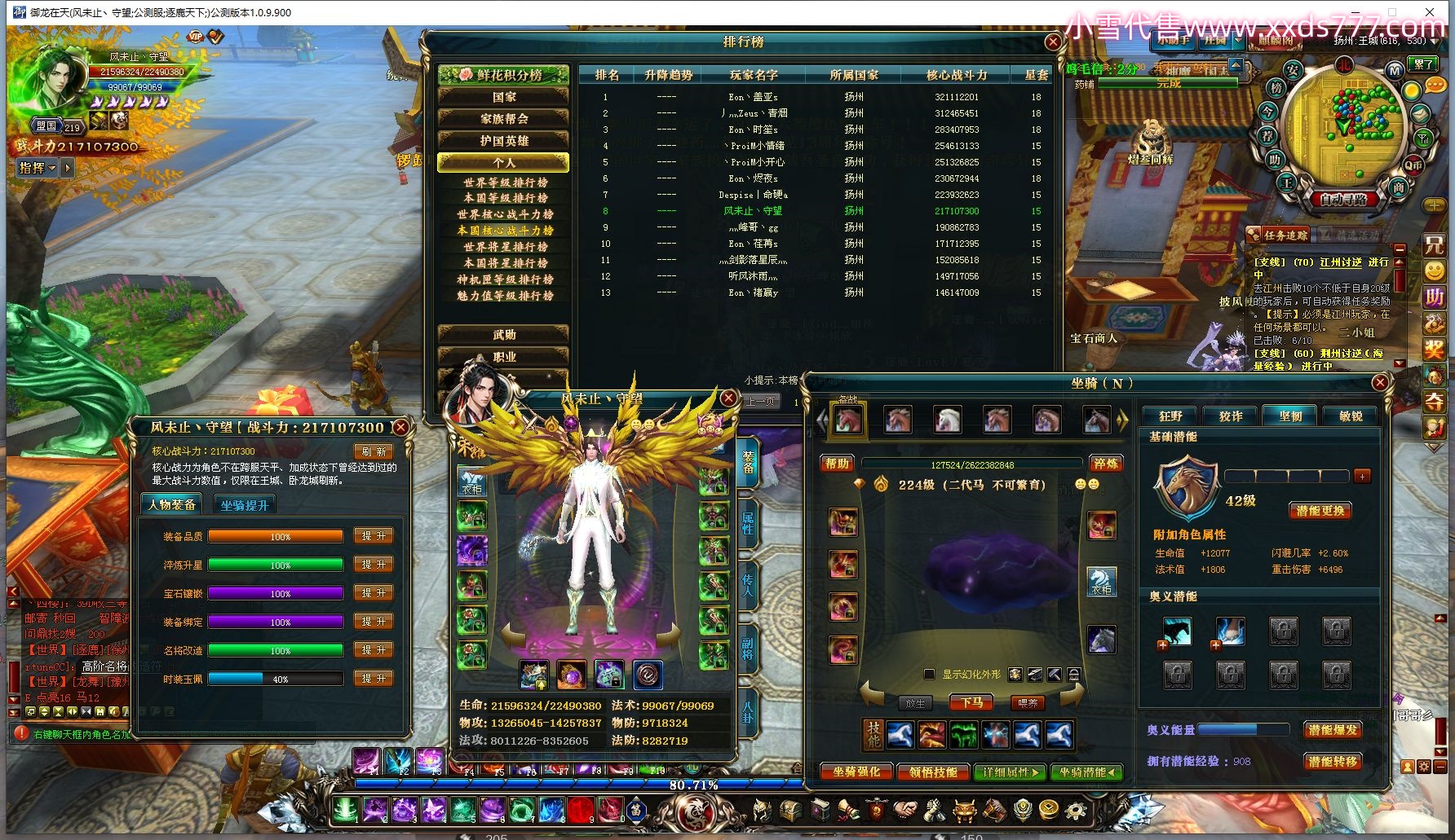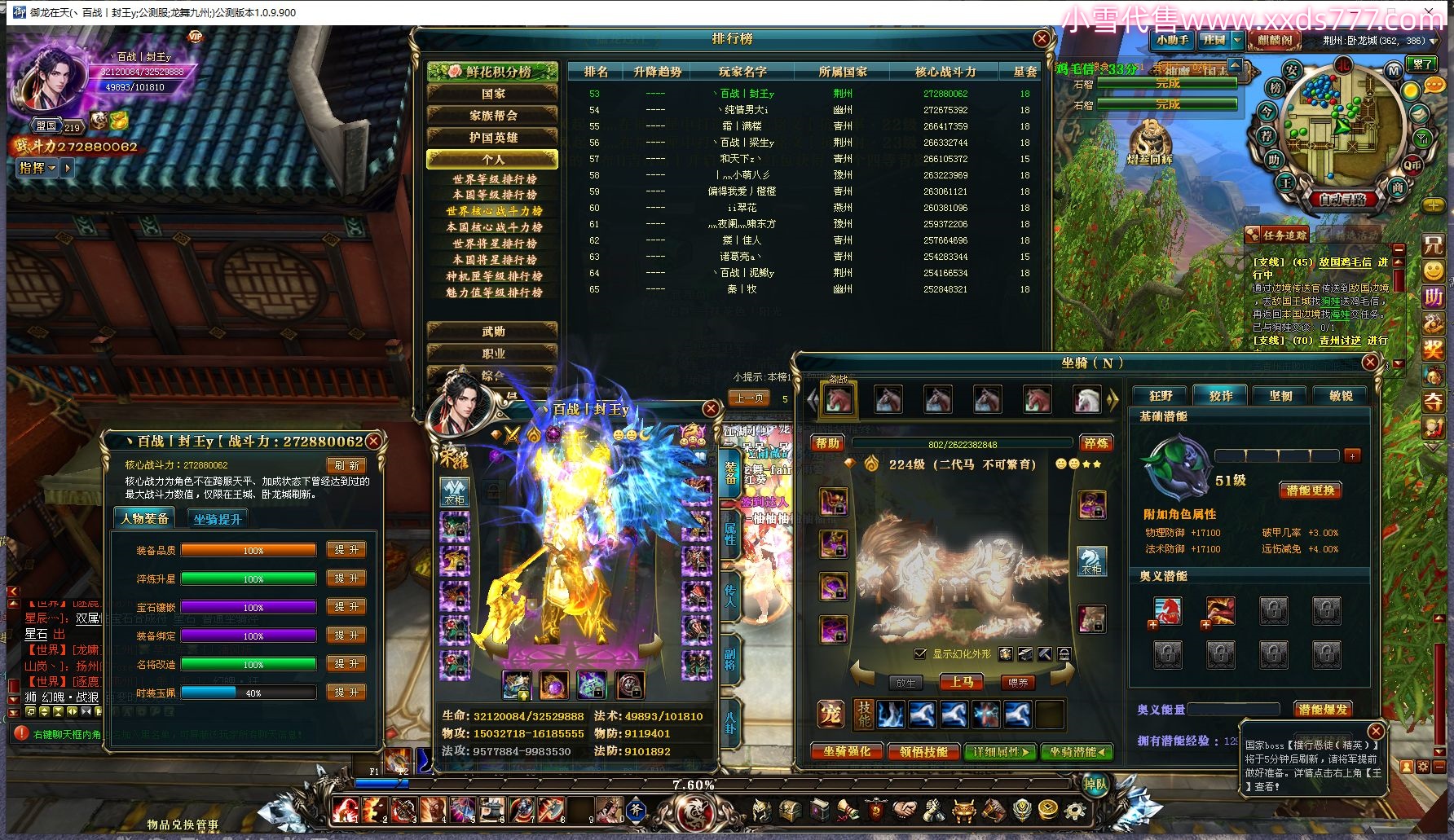 编号Q20722 临安公主Yyds 群龙纵横 徐州 世界排名8名 6275W战力 人物黄金极品橙18X(9件混沌) 马黄金极品橙13X(双潜能50级39级) 人物紫龙印 马绿龙印 六等单双属性石头 已开完永久15星套 已开1次永久18星套 可以转移百分百安全