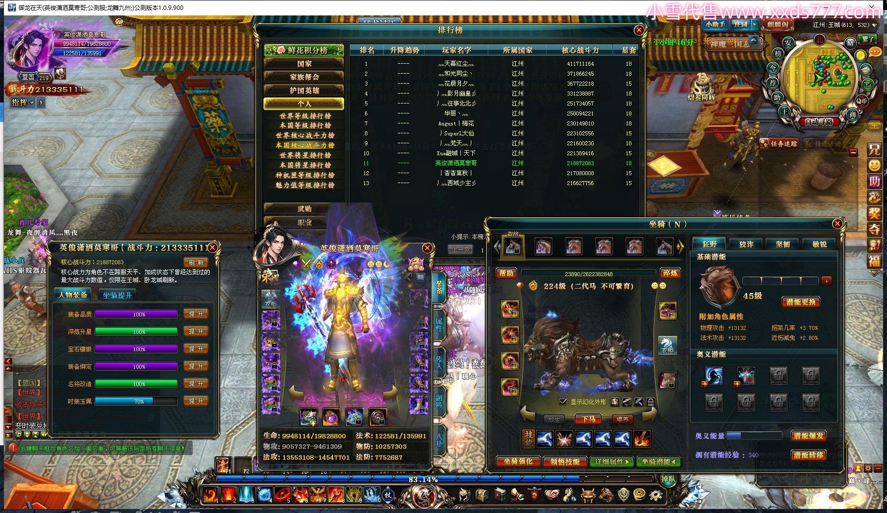 编号Q19498 书离i 群龙纵横 江州 本国排名8名 2313W战力 人物黄金普通橙12X(5件15X4件混沌) 马史诗紫9X 人物黄龙印(4件绿龙印) 马黄龙印 六等单双属性石头 可以转移百分百安全