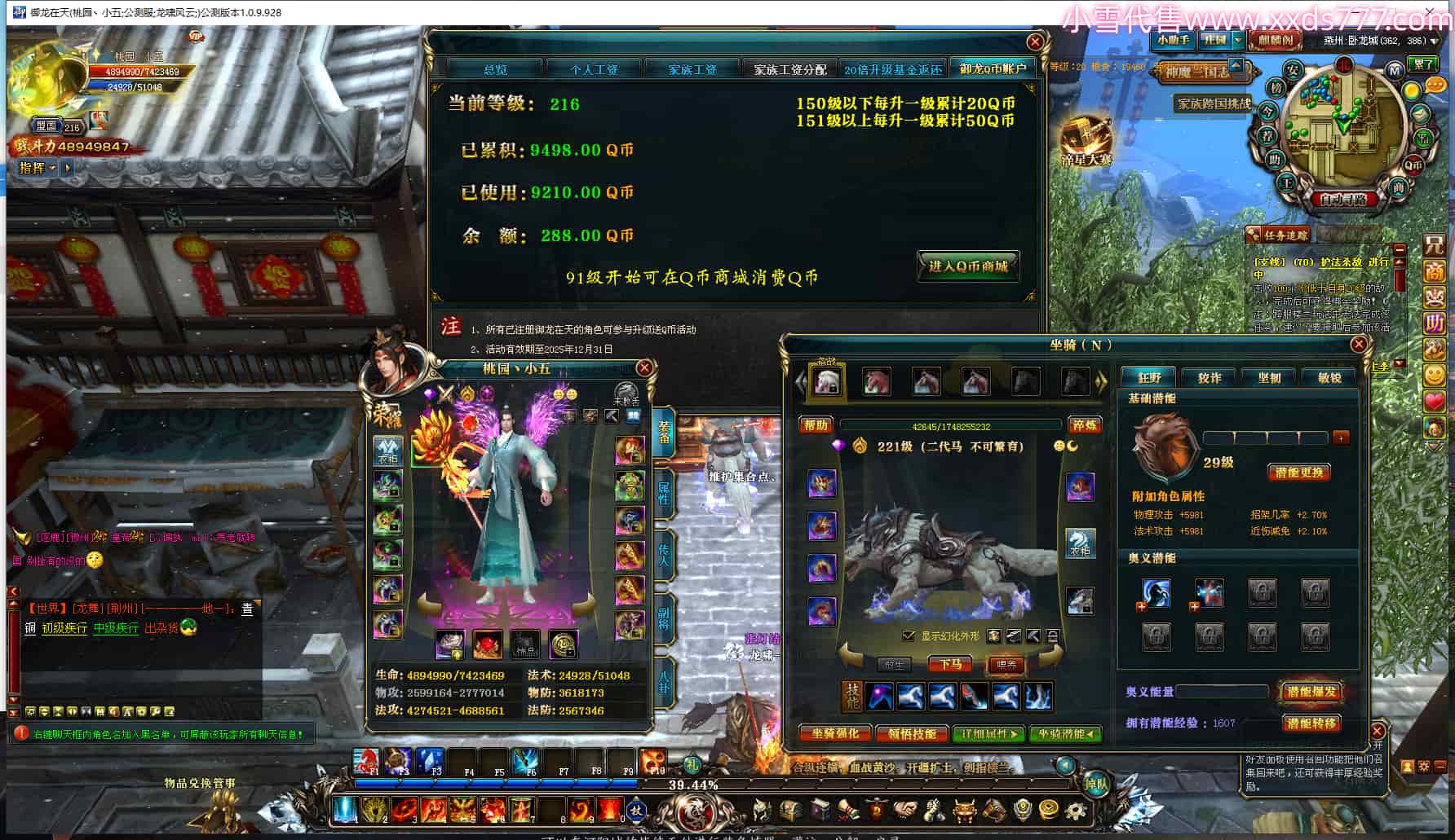 编号X25028 桃园丶小五 龙啸风云 燕州 216级 4894W战力 人物12X点星号 铭刻12级 点亮12星 传人12X 副将12X 马9X 人物黄龙印(4件绿龙印) 马蓝龙印 号内Q币288个 人物高淬41个 坐骑中淬29个