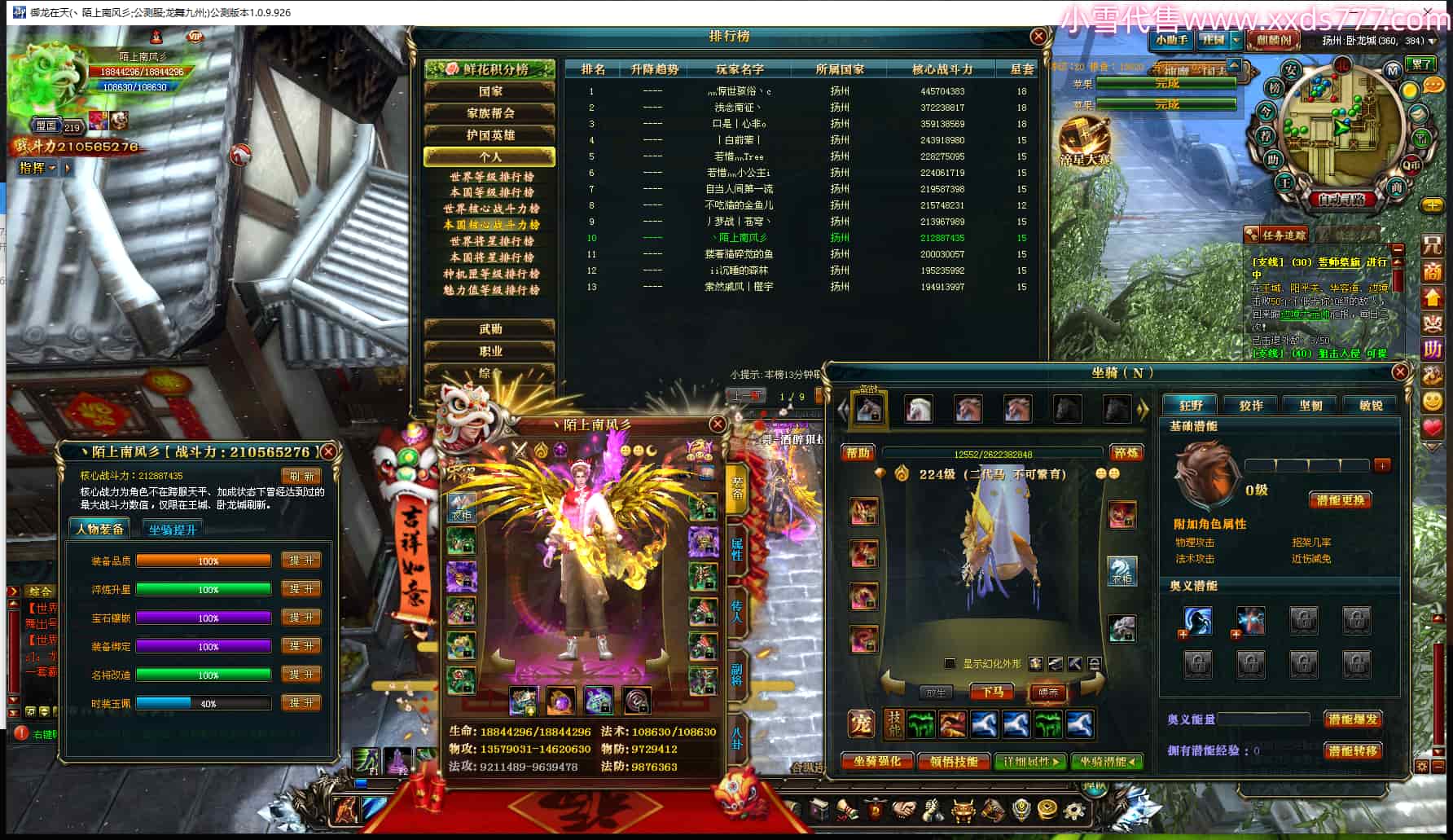 编号W23383 雨下整夜c 龙舞九州 扬州 本国排名20名 17821W战力 人物黄金普通橙15X(6件混沌) 传人精良紫15X 副将精良紫12X 马普通橙12X 极品紫15披风 人物星魂16级 传人星魂12级 副将星魂6级 马星魂13级 人物铭刻15级 人物点亮7件16星其余14星 马铭刻13级 点亮12星 人物绿龙印 马黄龙印 五六等单双属性完美无暇神圣石头 蓝黄孔 世界花榜第五