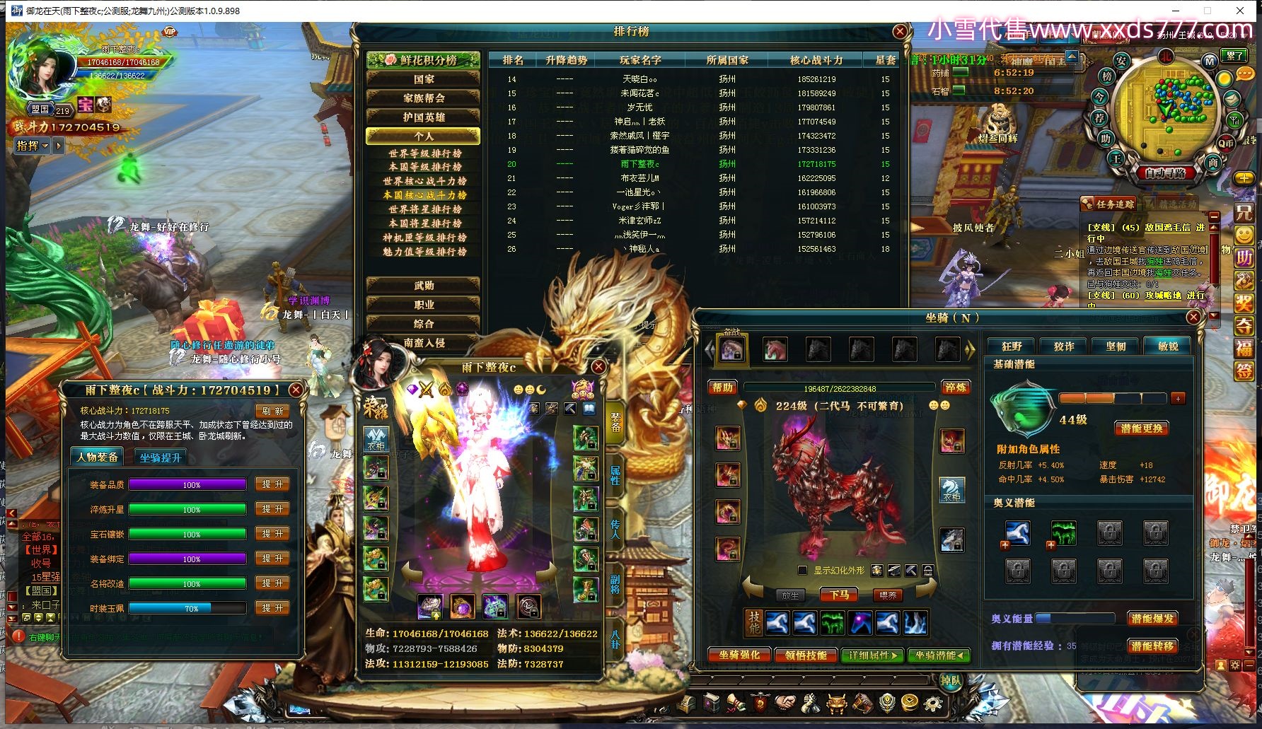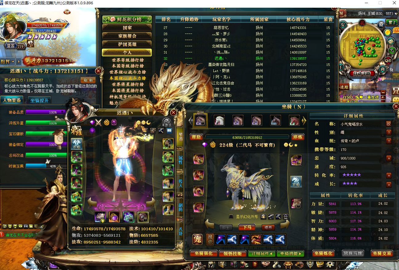 编号W22887 雨下整夜c 龙舞九州 扬州 本国排名20名 17270W战力 人物黄金普通橙15X(6件混沌) 传人精良紫12X 副将精良紫12X 马普通橙12X 极品紫15披风 人物星魂16级 传人星魂12级 副将星魂6级 马星魂12级 人物铭刻15级 人物点亮7件16星其余14星 马铭刻13级 点亮12星 人物绿龙印 马黄龙印 五六等单双属性完美无暇神圣石头 蓝黄孔 世界花榜第四