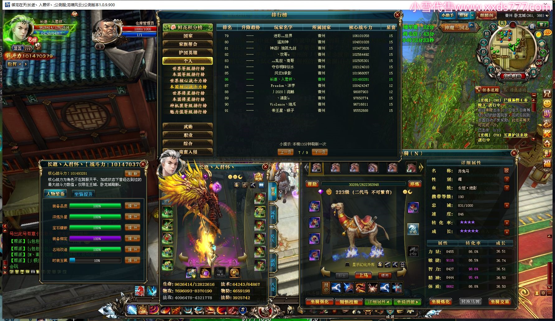 编号Q21430 v一表人才v 群龙纵横 扬州 本国排名26名 3371W战力 人物黄金普通橙15X(5件混沌) 马史诗紫10X 人物绿龙印(1件紫龙印) 马黄龙印 六等单双属性石头 已开6次永久15星套 可以转移百分百安全