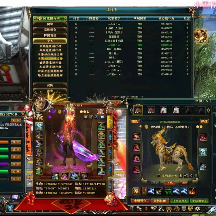 编号T24990 嘟l乐乐 龙腾问鼎 幽州 本国排名13名 22072W战力 人物黄金加强橙15X(1件18X9件混沌) 传人史诗紫12X 马普通橙11X 极品紫15披风 人物星魂16级 传人星魂13级 副将星魂6级 马星魂16级 人物铭刻1件18级1件17级其余16级 点亮16星 马铭刻15级 点亮12星 人物绿龙印 马黄龙印 五六等单双属性完美神圣石头 黄绿孔 可以转移百分百安全