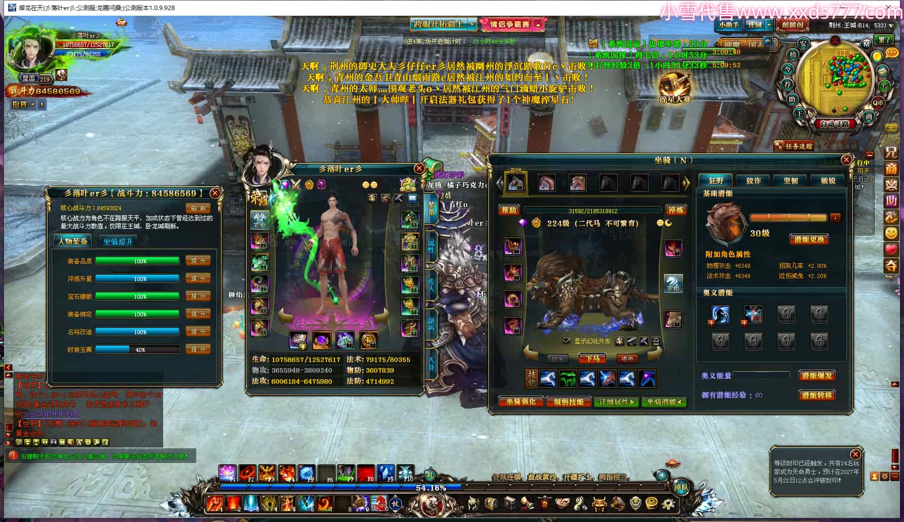 编号T25034 彡落叶er彡 龙腾问鼎 荆州 8458W战力 人物史诗紫12X(3件混沌) 传人精良紫12X 副将加强紫12X 马极品紫9X 精良紫11披风 人物星魂12级 传人星魂6级 副将星魂3级 马星魂7级 人物铭刻2件15级3件13级其余12级 点亮2件14星其余12星 马铭刻12级 点亮10星 人物绿龙印 马蓝龙印 五等单双属性完美神圣石头 黄蓝孔