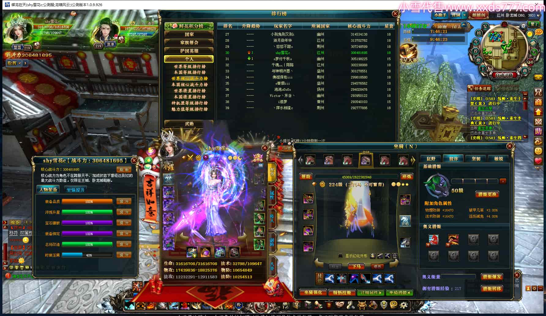 编号Q24891 丨秋落唔桐丨 群龙纵横 燕子 本国第19名 3404W战力 人物黄金普通紫12X(3件15X) 极品紫马9X 人物绿龙印(衣服紫) 马黄龙印 六等单双属性石头 国婚时装