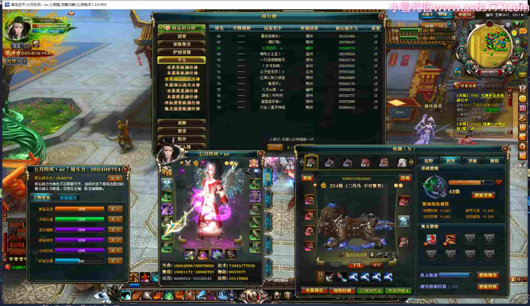 编号T23561 七月的风丶oc 龙腾问鼎 幽州 世界排名68名 26040W战力 人物黄金极品橙15X(2件18X9件混沌) 传人黄金普通橙15X(4件混沌) 副将精良紫12X 马普通橙12X 极品紫16披风 人物星魂16级 传人星魂14级 副将星魂6级 马星魂16级 人物铭刻7件16级其余15级 点亮16星 马铭刻1件15级其余12级 点亮1件14星其余12星 人物绿龙印(2件紫龙印) 马黄龙印 六等单双属性完美无暇神圣石头 黄绿孔 已开启永久18星套
