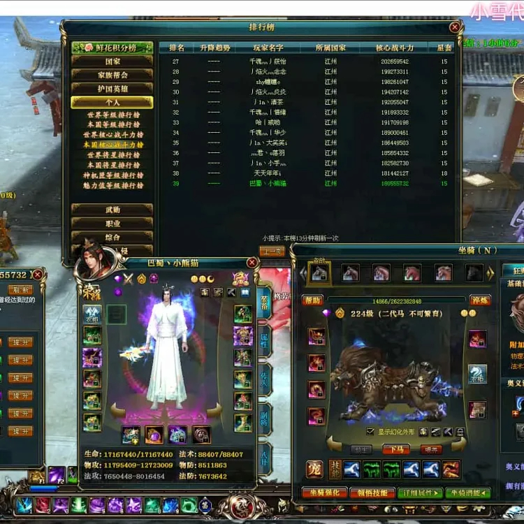 编号X24697 巴蜀丶小熊猫 龙啸风云 江州 本国排名39名 18055W战力 人物黄金普通橙15X(5件混沌) 传人精良紫15X 副将精良紫12X 马普通橙12X 精良紫15披风 人物星魂16级 传人星魂10级 副将星魂6级 马星魂12级 人物铭刻15级 人物点亮16星 马铭刻4件14级其余12级 点亮12星 人绿龙印(2件紫龙印) 马黄龙印 五六等单双属性神圣完美优秀石头 黄蓝孔 已开5次永久15星套