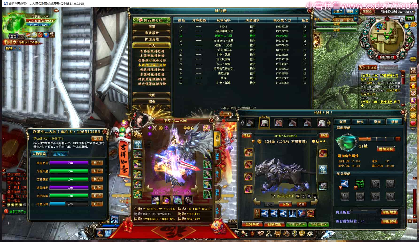 编号X24862 浮梦生灬人间 龙啸风云 豫州 本国排名16名 19651W战力 人物黄金史诗紫15X(7件混沌) 传人精良紫15X 副将极品紫12X 马普通橙11X 极品紫15披风 人物星魂16级 传人星魂11级 副将星魂6级 马星魂16级 人物铭刻1件17级其余15级 差一件点亮16星 马铭刻12级 点亮12星 人物绿龙印 马黄龙印 五六等单双属性神圣完美无暇石头 蓝黄孔 已开启永久15星套