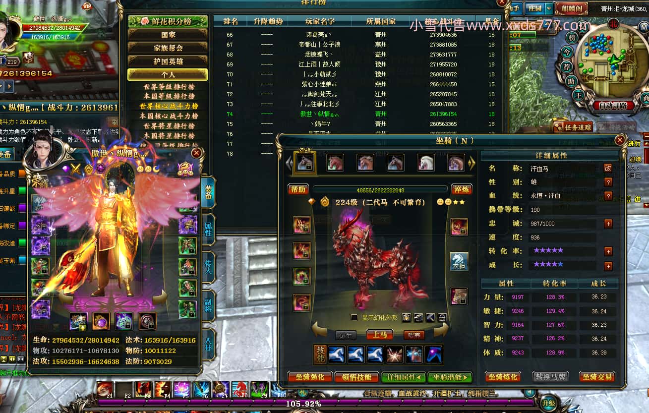 编号T24824 灬围观小伙o丶 龙腾问鼎 青州 本国排名11名 22184W战力 人物黄金普通橙15X(1件18X7件混沌) 传人极品紫12X 副将精良紫12X 马普通橙13X(双潜能50级34级) 极品紫15披风 人物星魂16级 传人星魂13级 副将星魂6级 马星魂16级 人物铭刻2件16级其余15级 人物点亮16星 马铭刻13级 点亮14星 人物绿龙印(1件紫龙印) 马黄龙印 六等单双属性完美无暇神圣石头 黄绿孔 已开完永久15星套 可以转移百分百安全