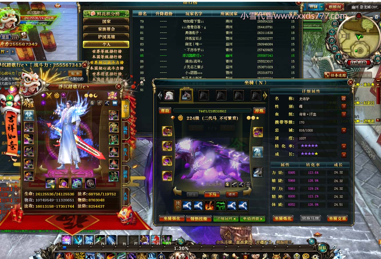 编号T24795 浮沉踏歌行c丶 龙腾问鼎 幽州 世界第85名 25556W战力 人物黄金史诗紫15X(武器衣服18X 9件混沌) 传人极品紫15X 副将加强橙12X 马黄金橙13X 极品紫15披风 人物星魂16级 传人星魂12级 副将星魂6级 马星魂16级 人物铭刻1件17级5件16级其余15级 点亮16星 马铭刻1件13级其余14级 点亮14星 人物绿龙印 马黄龙印 五六等单双属性完美无暇神圣石头 黄蓝绿孔 已开1次永久15星套