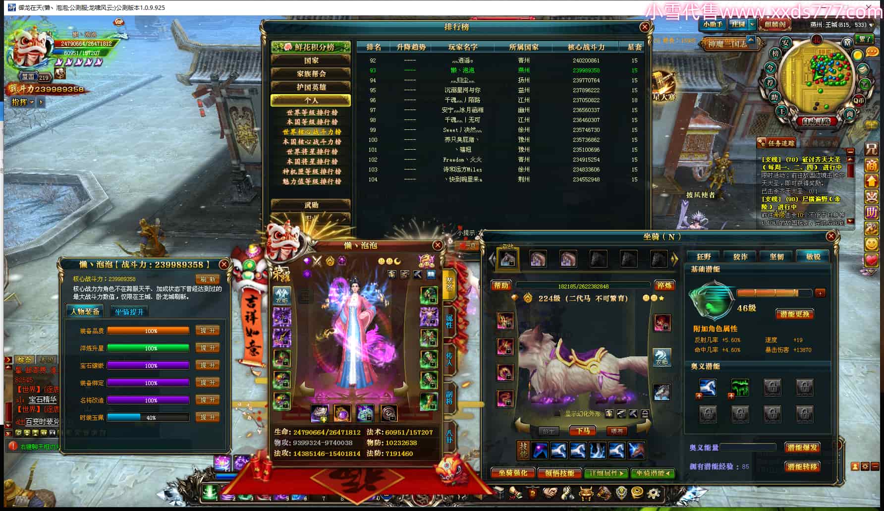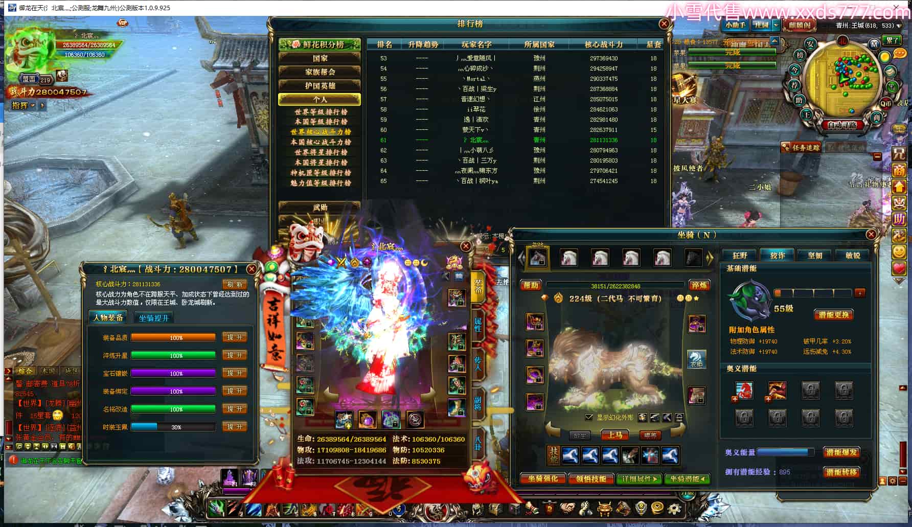 编号W24363 爱笑的闹闹i 龙舞九州 徐州 世界排名35名 32244W战力 人物混沌极品橙15X(1件18X) 传人黄金普通橙15X 副将史诗紫12X 马黄金精良橙13X(双潜能57级54级) 史诗紫17披风 人物星魂16级 传人星魂16级 副将星魂13级 马星魂16级 人物铭刻1件18级4件16级其余15级 点亮1件18星其余16星 马铭刻13级 点亮14星 人物紫龙印 马绿龙印 六等单双属性神圣完美无暇石头 黄绿紫孔 已开启永久18星套
