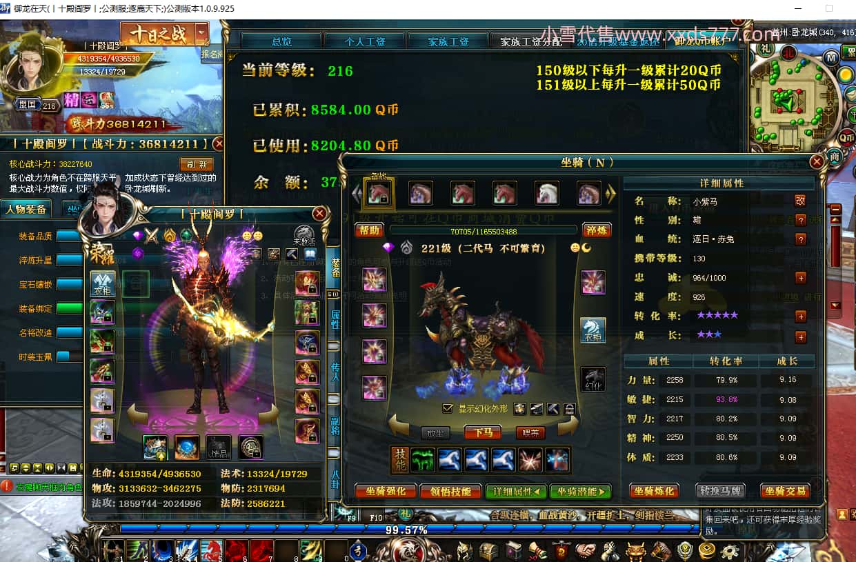 编号T19430 丿夜丶轻狂灬 龙腾问鼎 青州 209级 人物12X点星号 铭刻12级 点亮12星 传人12X 副将12X 马9X 号内Q币300个 人物高淬221个 坐骑中淬49个 可以转移百分百安全