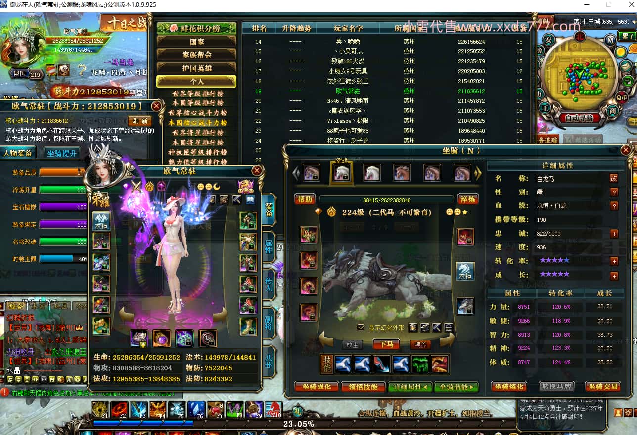 编号W23566 吹牛大王c 龙舞九州 益州 世界排名13名 40201W战力 人物混沌极品橙18X 传人黄金加强橙18X(4件混沌) 副将史诗紫15X 马黄金极品橙14X(双潜能66级65级) 普通橙18披风 人物星魂16级 传人星魂16级 副将星魂16级 马星魂16级 人物铭刻18级 点亮18星 马铭刻2件16级其余15级 点亮14星 人物紫龙印 马绿龙印 六等单双属性神圣石头 绿紫孔 可以转移百分百安全