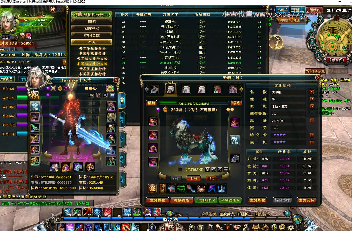 编号X24526 小别兔别又别i 龙啸风云 幽州 世界排名23名 32838W战力 人物混沌极品橙15X(4件18X) 传人黄金普通橙15X 副将史诗紫15X 马黄金加强橙14X(双潜能50级41级) 极品紫16披风 人物星魂16级 传人星魂16级 副将星魂14级 马星魂16级 人物铭刻2件18级2件16级其余15级 人物点亮2件18星其余16星 马铭刻14级 点亮14星 人绿龙印(3件紫龙印) 马绿龙印 六等单双属性神圣完美优秀石头 绿紫孔 已开启永久18星套