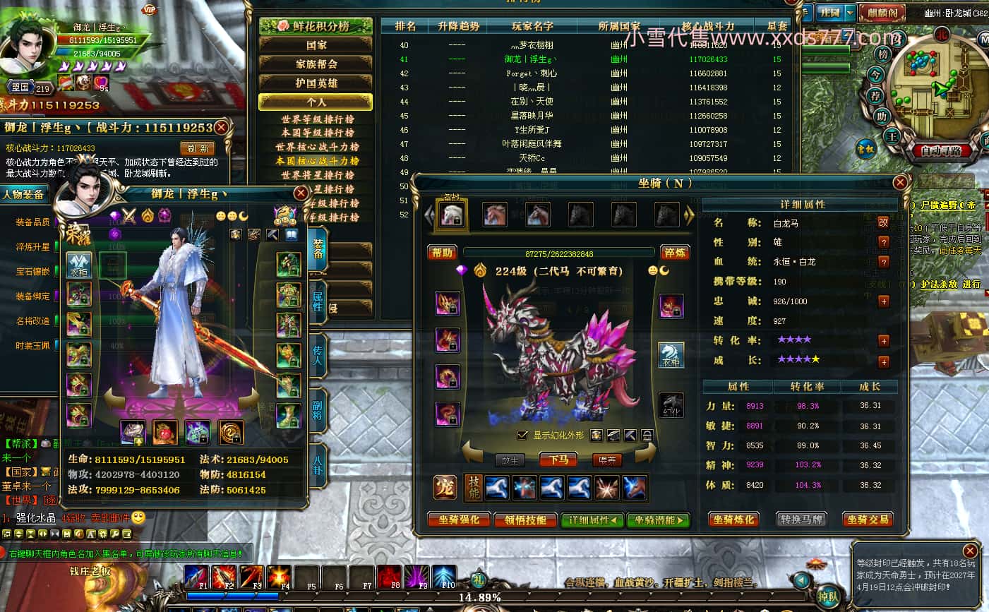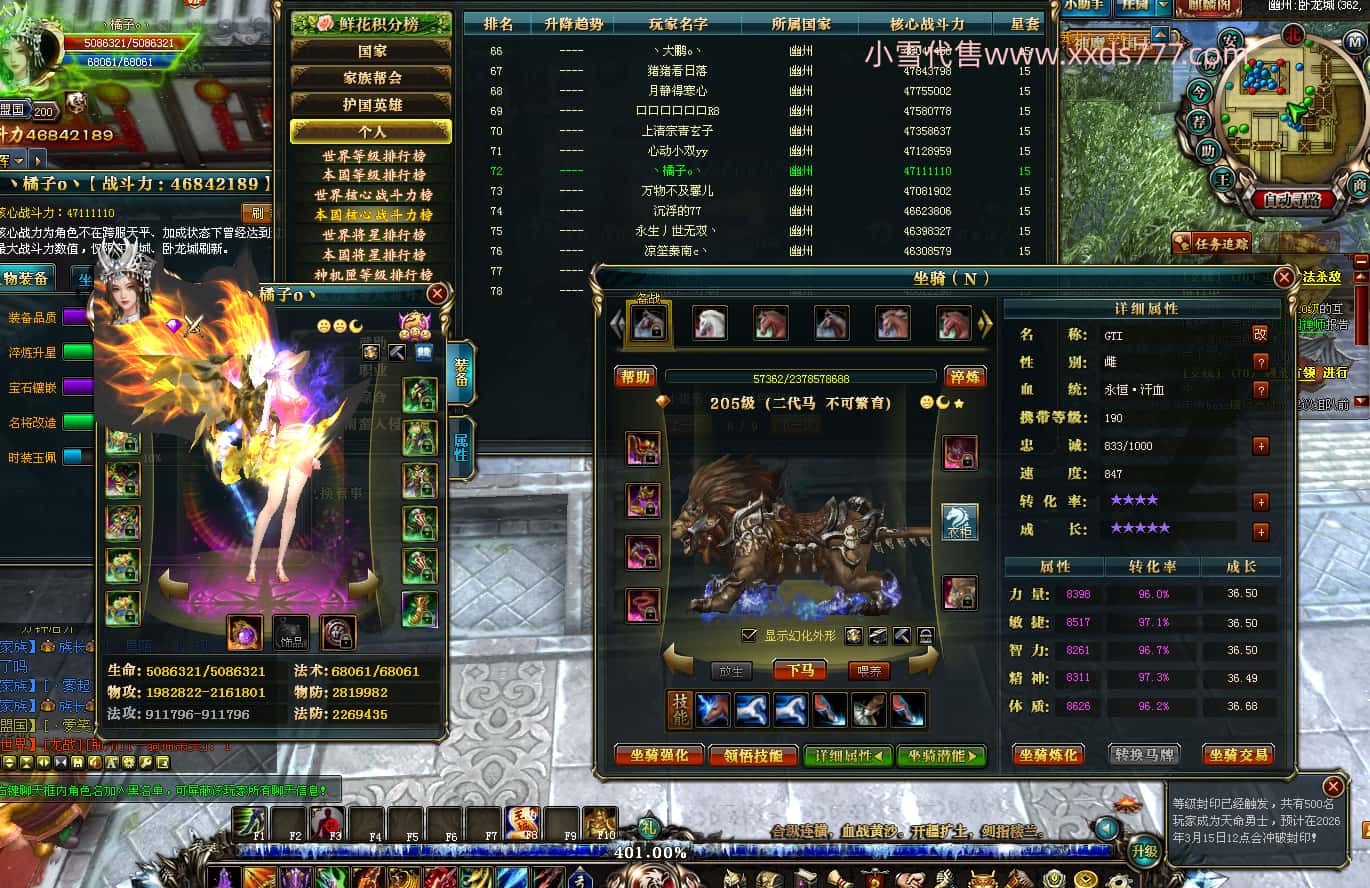 编号L24808 o雷德o 龙战王者 燕州 世界排名第99名 5886W战力 人物黄金普通橙15X(8件混沌) 马黄金加强橙12X 龙魂289级 人物8件紫+3件绿龙印 马黄龙印 已开9次永久15星套 可以转移百分百安全