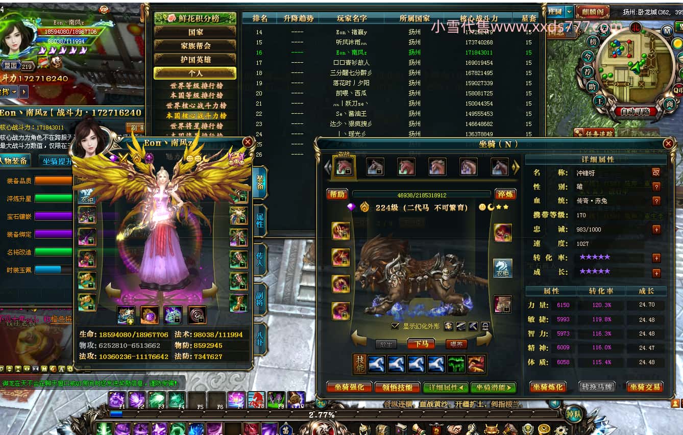 编号Q24804 陌然浅尘兮o灬 潜龙九霄 扬州本国第7名 609W战力 人物普通紫12X 加强紫马9X