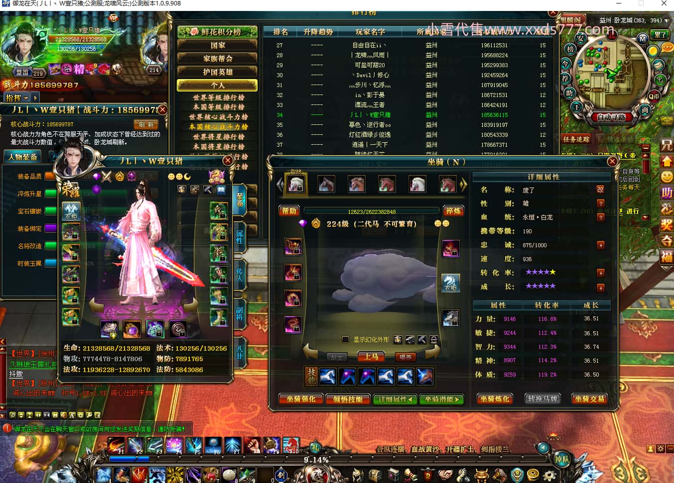 编号Q23573 攒钱换装备 群龙纵横 徐州 世界第12名 7856W战力 人物黄金极品橙18X(9件混沌) 马黄金精良橙13X 人物紫龙印 马绿龙印 6等单双属性石头 已开完永久15星 开了1次永久18星套 可以转移百分百安全